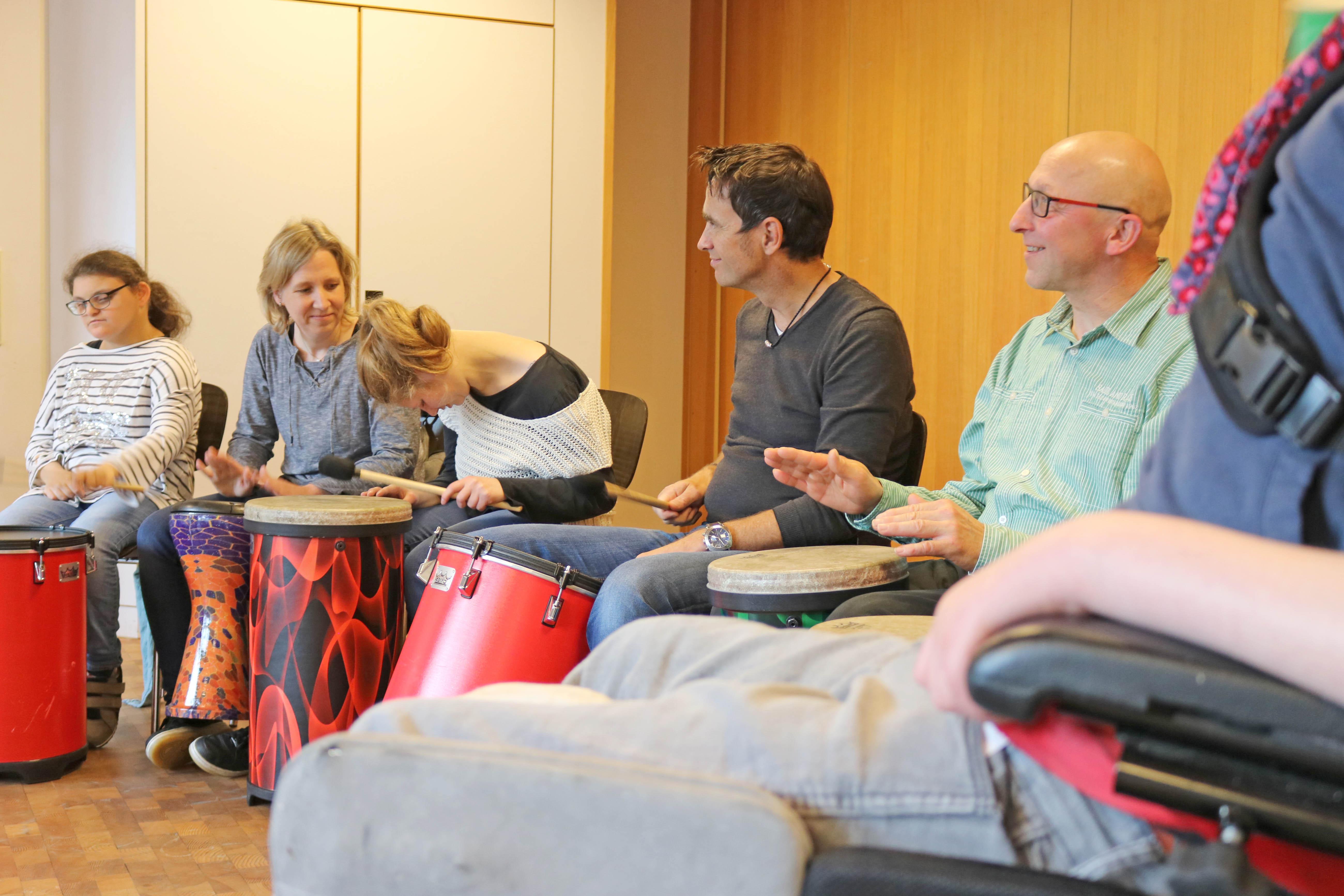 Oldenburg, 03.11.2017 - Sonst sind sie Stahlbauschlosser, Programmierer, Fertigungsleiter, arbeiten im Büro oder an riesigen Maschinen. Heute sind sie zusammen mit ihrem Chef, Dirk Schade, von Wildeshausen nach Oldenburg gekommen, um den Regenbogenkindern eine Spende zu überbringen: 3000 Euro haben Sie im Gepäck. Davon sollen Spielgeräte für die Kinder und Jugendlichen mit Behinderungen gekauft werden und Trommelworkshops organisiert werden. Denn Einrichtungsleiterin Ute Dorczok hatte Dirk Schade berichtet, dass viele Kinder und Jugendliche sehr empfänglich für die Rhythmen und Klänge von Percussion-Instrumenten sind. Unter der Anleitung von Pop-Kantor Steffen Schöps verwandelte sich die Spendenübergabe zur großen Freude der Kinder aus Haus Regenbogen in einen unüberhörbaren Trommelnachmittag. Zum sonoren Klang der tiefen Trommeln spielten die Teilnehmer auf Bongos, Rasseln und anderen Percussioninstrumenten. So haben Dirk Schade und seine Mitarbeiter selbst gesehen, wie Ihre Weihnachtsspende im Haus Regenbogen verwendet wird.
