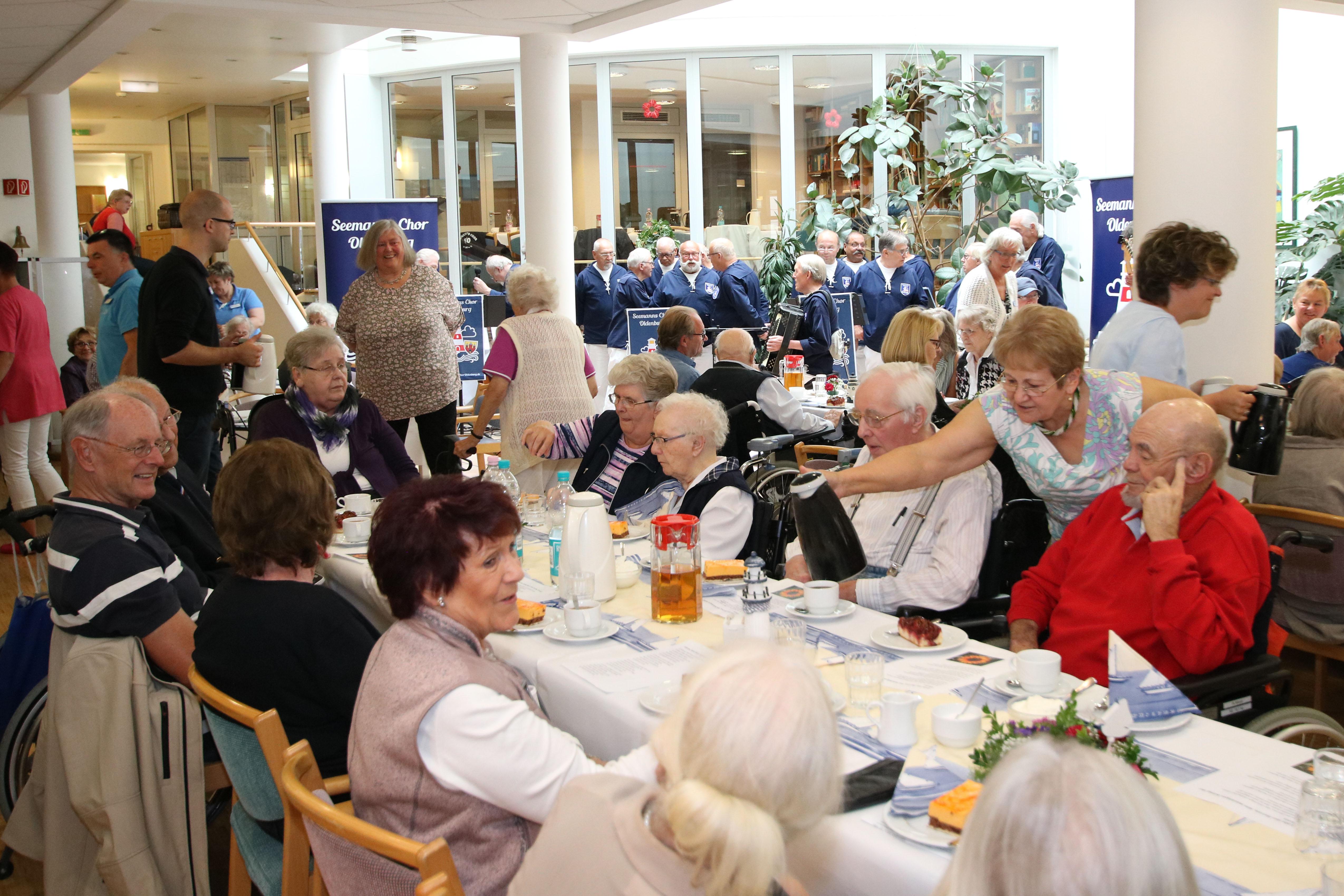 Oldenburg, 22. Aug. 2017 – Mit Angehörigen, Kindern, Enkeln, Nachbarn, Mitarbeitenden und Ehrenamtlichen feierten die Senioren im Büsingstift am 22. August ein großes Sommerfest. Zum Auftakt hielt Pastorin Christiane Cuno eine Andacht zum Thema Trost: „Die Sonne scheint auch an trüben Tagen.“ Der seit 1974 bestehende Shantychor Oldenburg sang mitten zwischen den Besuchern. Einrichtungsleiterin Hilke Wulf sorgte mit ihrem Team für Kaffee, Kuchen, Eis und Sommerbowle. Solche Bowlen waren in den 50er, 60er Jahren sehr beliebt. Sie schmecken gut und wecken Erinnerungen, weiß die Leiterin des diakonischen Hauses. Begleitend zum Fest wurden an Ständen Geschenkartikel, handgefertigte Seifen, Schmuck und Handarbeiten angeboten. Wegen seiner Lage im Zentrum der Stadt wird das Büsingstift von alten Oldenburgern besonders geschätzt.