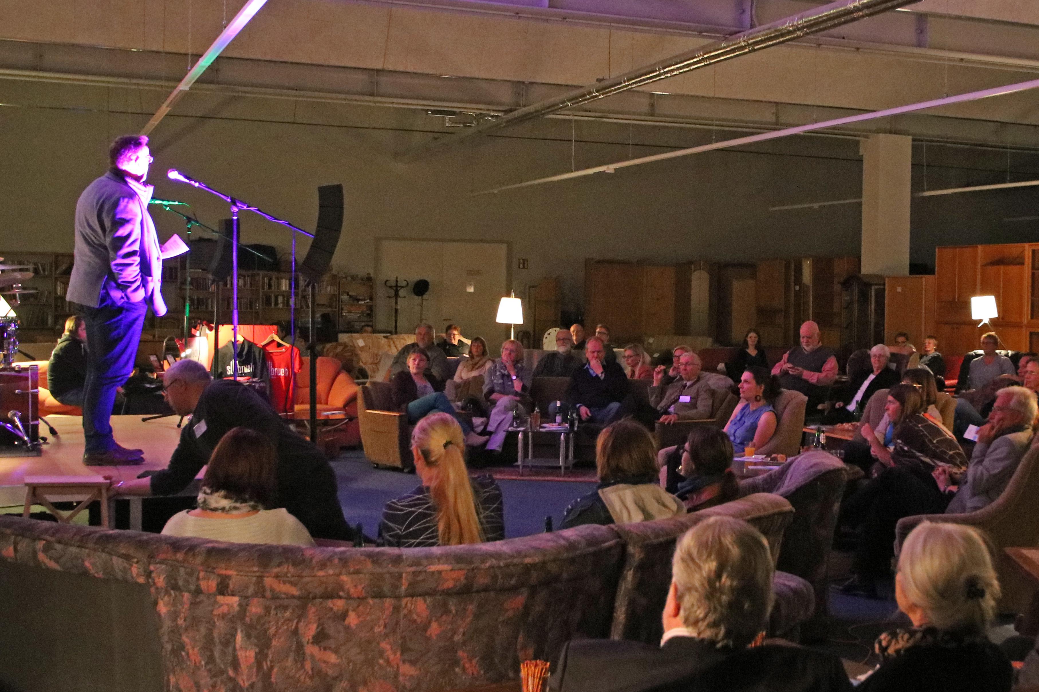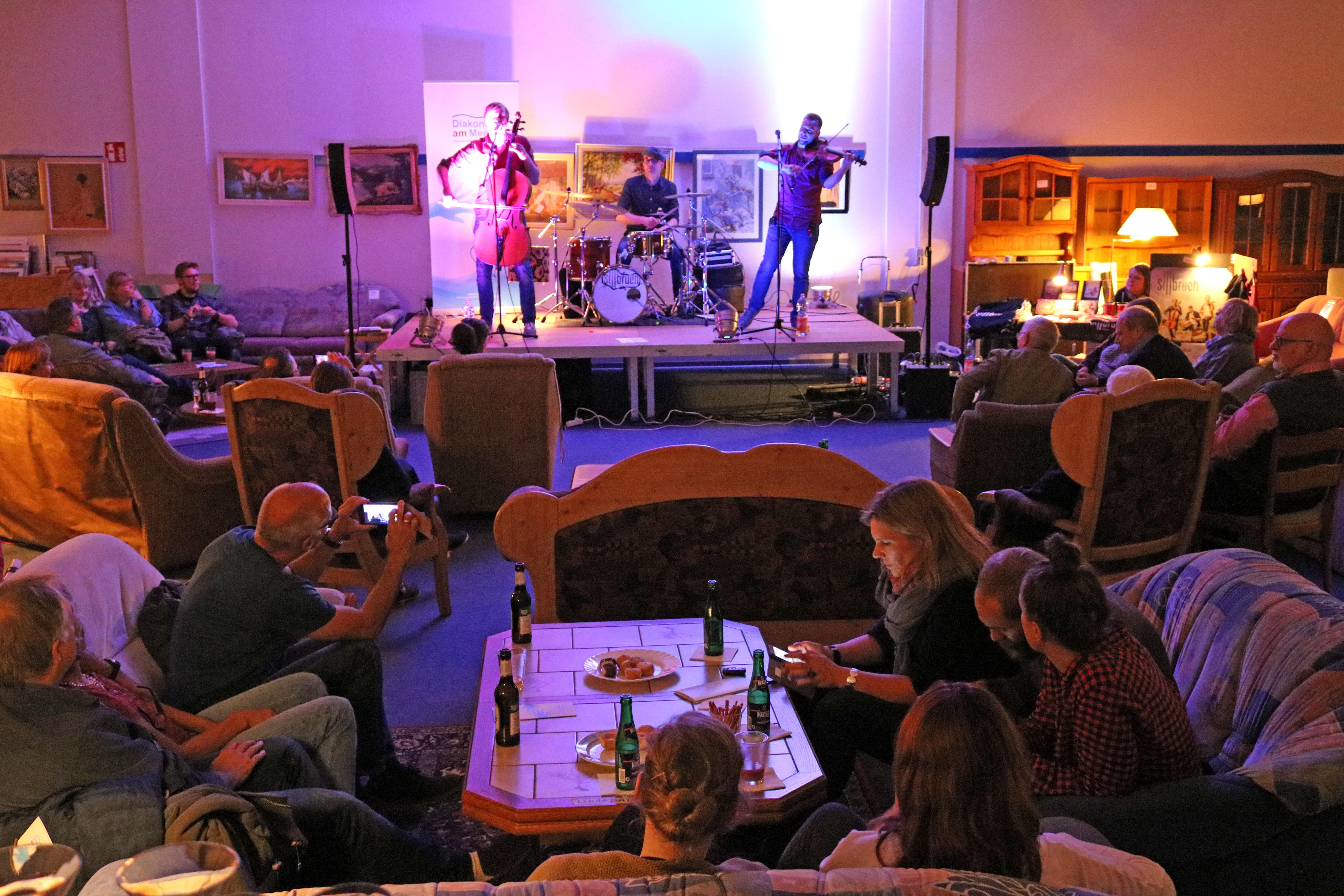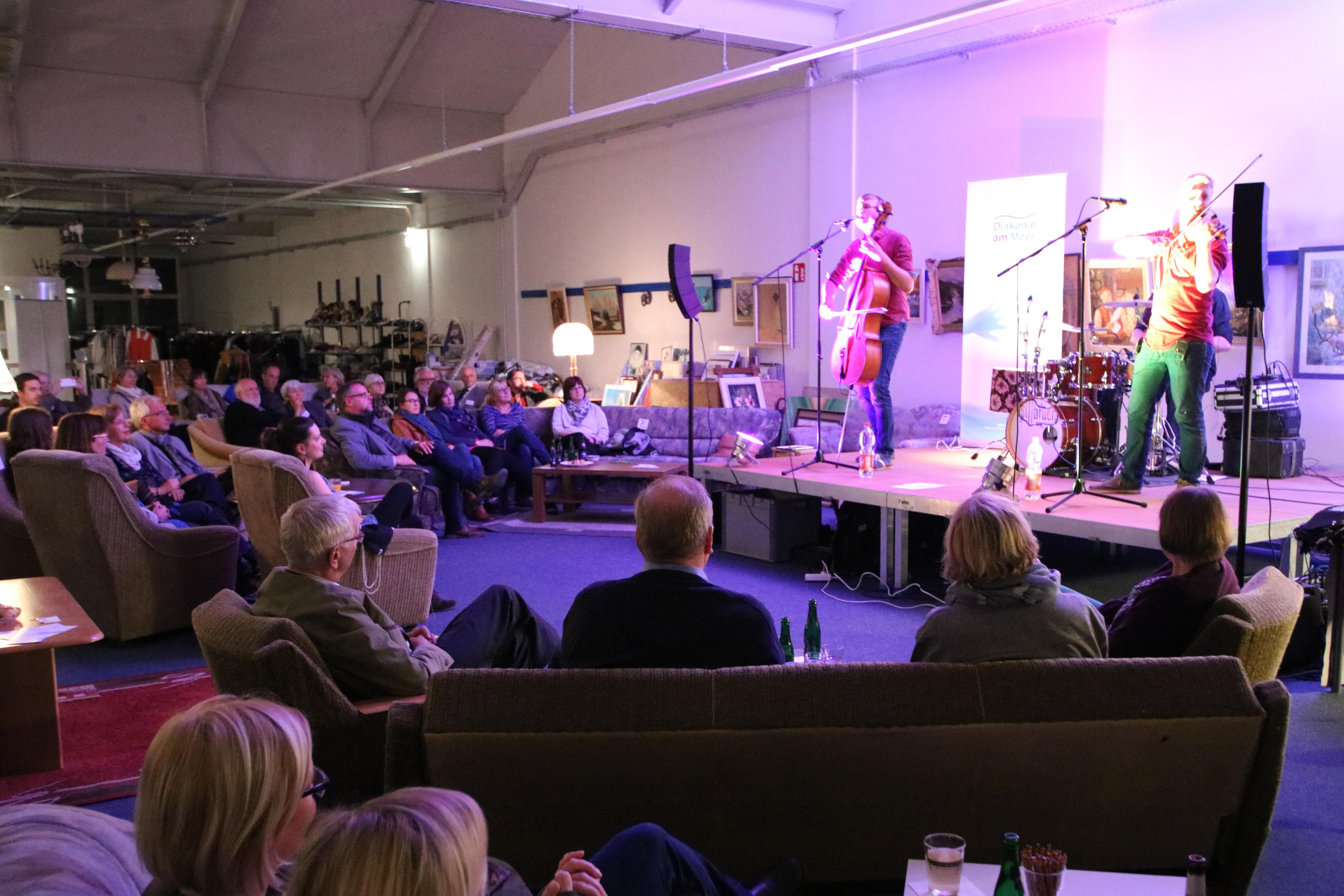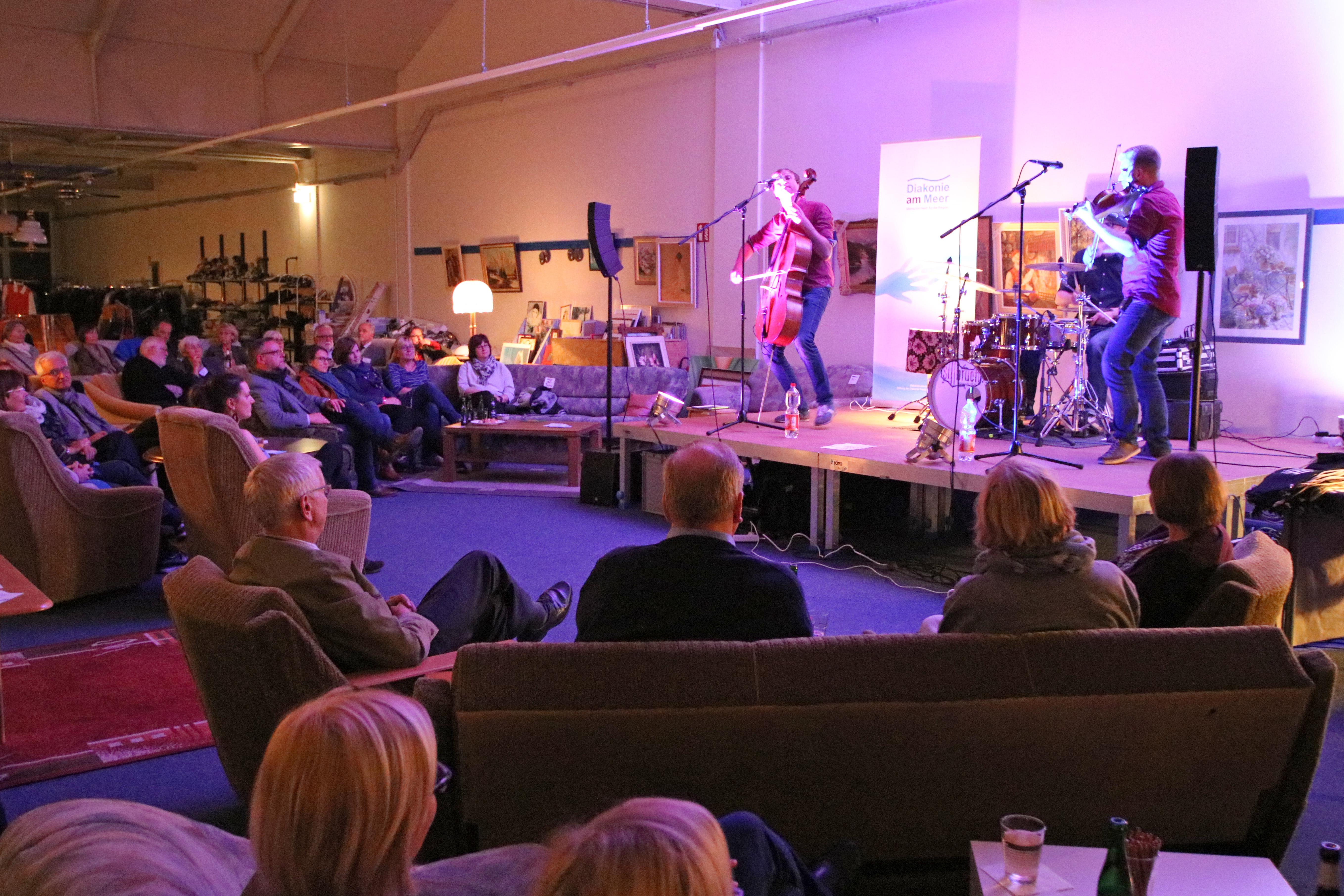 Wilhelmshaven, 29.09.2017 - Aus Anlass der Woche der Diakonie tourt die Gruppe Stilbruch durch zehn niedersächsische Städte. Mit dem Konzert im Sozialkaufhaus der Diakonie in Wilhelmshaven wurde die neue Diakonie-Stiftung am Meer vorgestellt. Unter dem Motto mehr Menschlichkeit für die Region fördert die neue Stiftung Projekte für in Not geratene Menschen in Friesland und Wilhelmshaven. Der Grundstock für die Stiftung wurde durch eine Erbschaft und eine Zustiftung gelegt. Das versetzte die Stiftung in die Lage ein Flüchtlingswohnheim zu erwerben und renovieren, berichten die Stiftungsvorstände Klaus Lücken und Hildegard Kriebietzsch. Sie hoffen auf weitere Unterstützung für die Stiftung von Firmen und Einzelpersonen. Im eigens für das Konzert umgeräumten Sozialen Kaufhaus der Diakonie spielte die Gruppe Stilbruch rockige Popmusik mit klassischen Instrument. Sessel und Sofas, Tische und Stühle verwandelten die Halle zum großen Wohnzimmer mit toller Akkustik, freuten sich die Musiker. Sebastian Maul, Eli Fabrikant und Gunnar Nilsson füllen mittlerweile europaweit Konzerthallen, kehren aber gerne auch zu den Wurzeln in der Straßenmusik zurück. den selbst komponierten Songs hat Stilbruch begeisterte Zuhörer gewonnen. Mit ihrem aktuellen Album "Nimm mich mit" ist die Band im Mai diesen Jahres beim evangelischen Kirchentag aufgetreten. Im Rahmen der Diakonie-Tour unterstützt die Band die diesjährige Kampagne der Diakonie unter der Überschrift "Glaube Hoffnung Nächstenliebe".