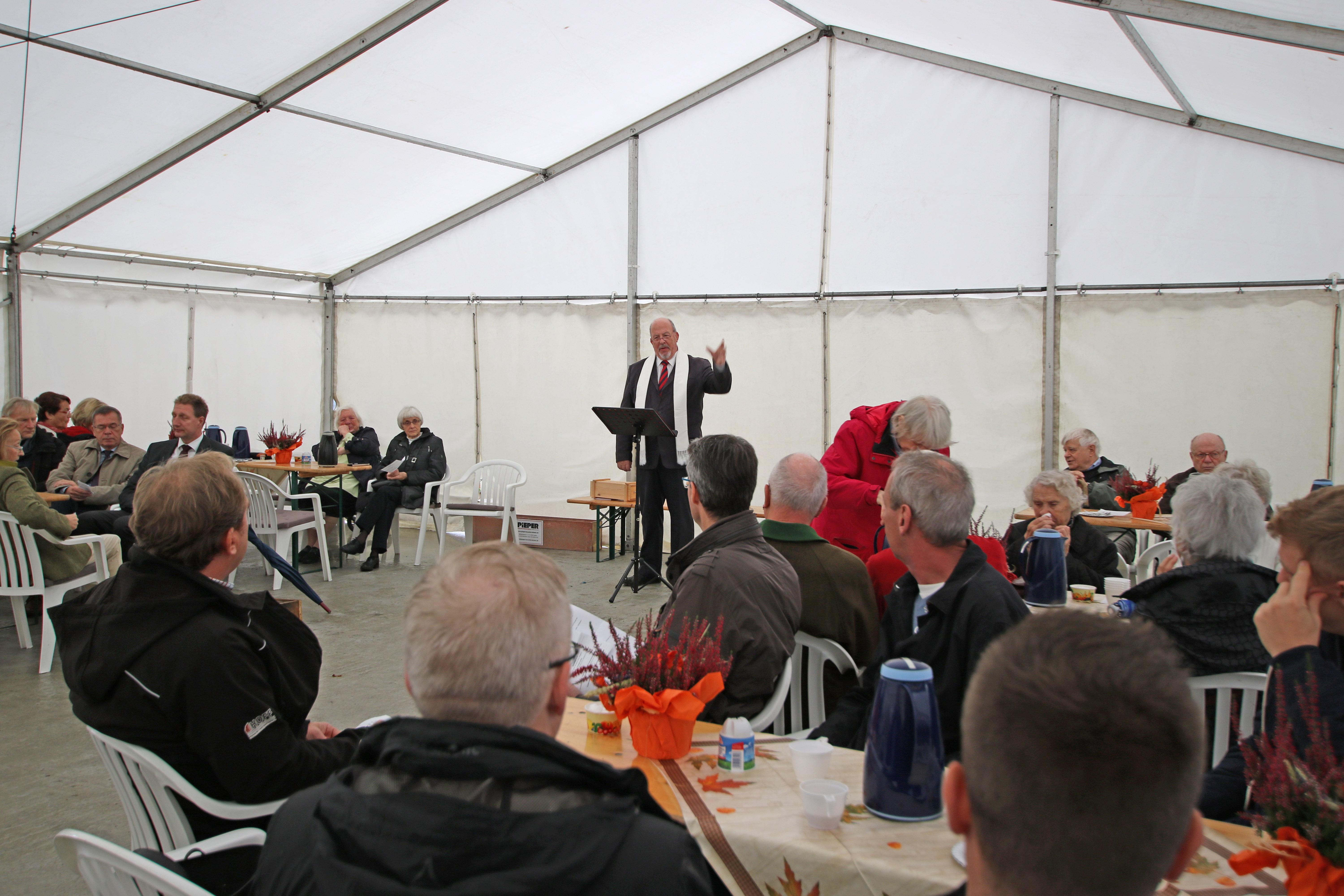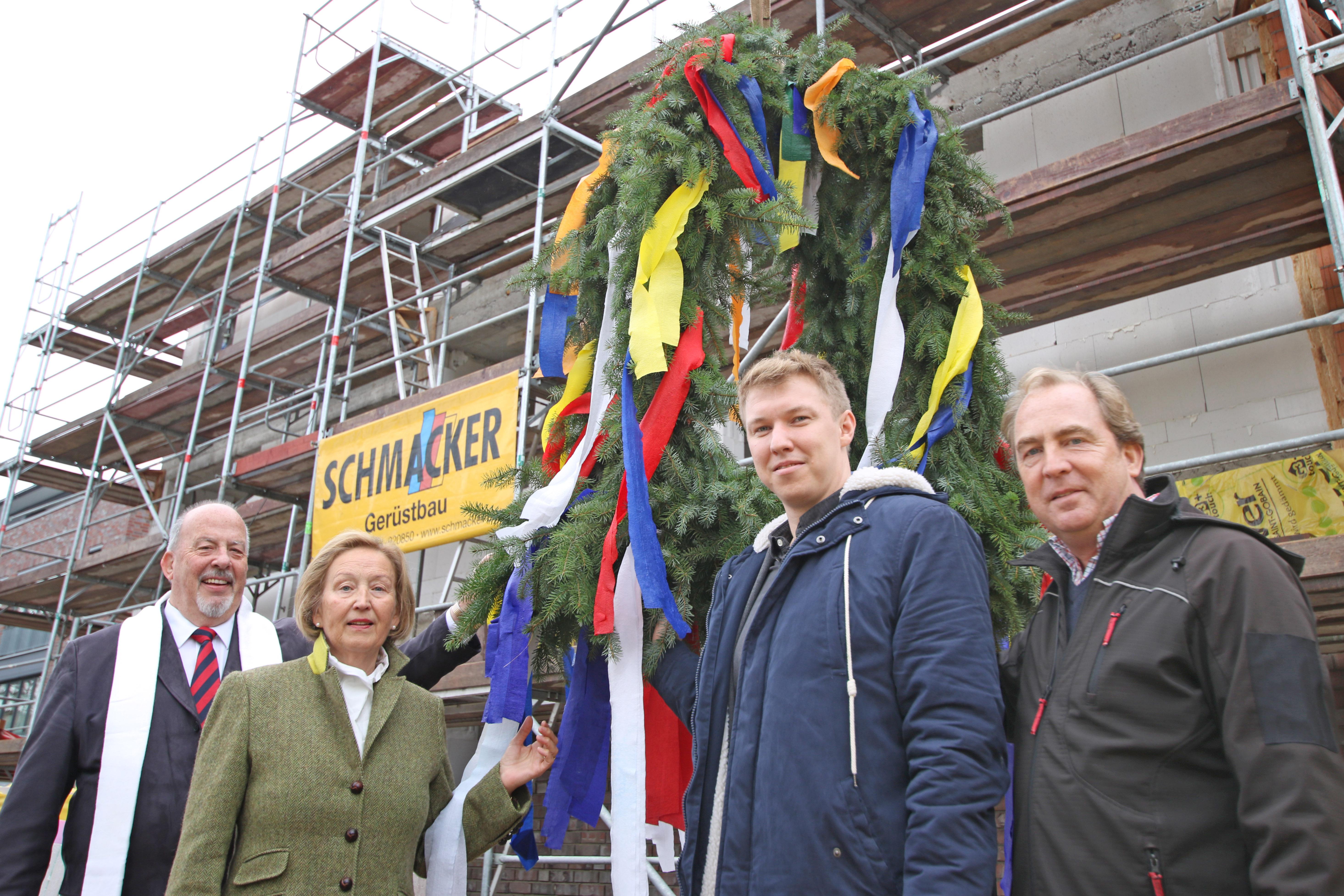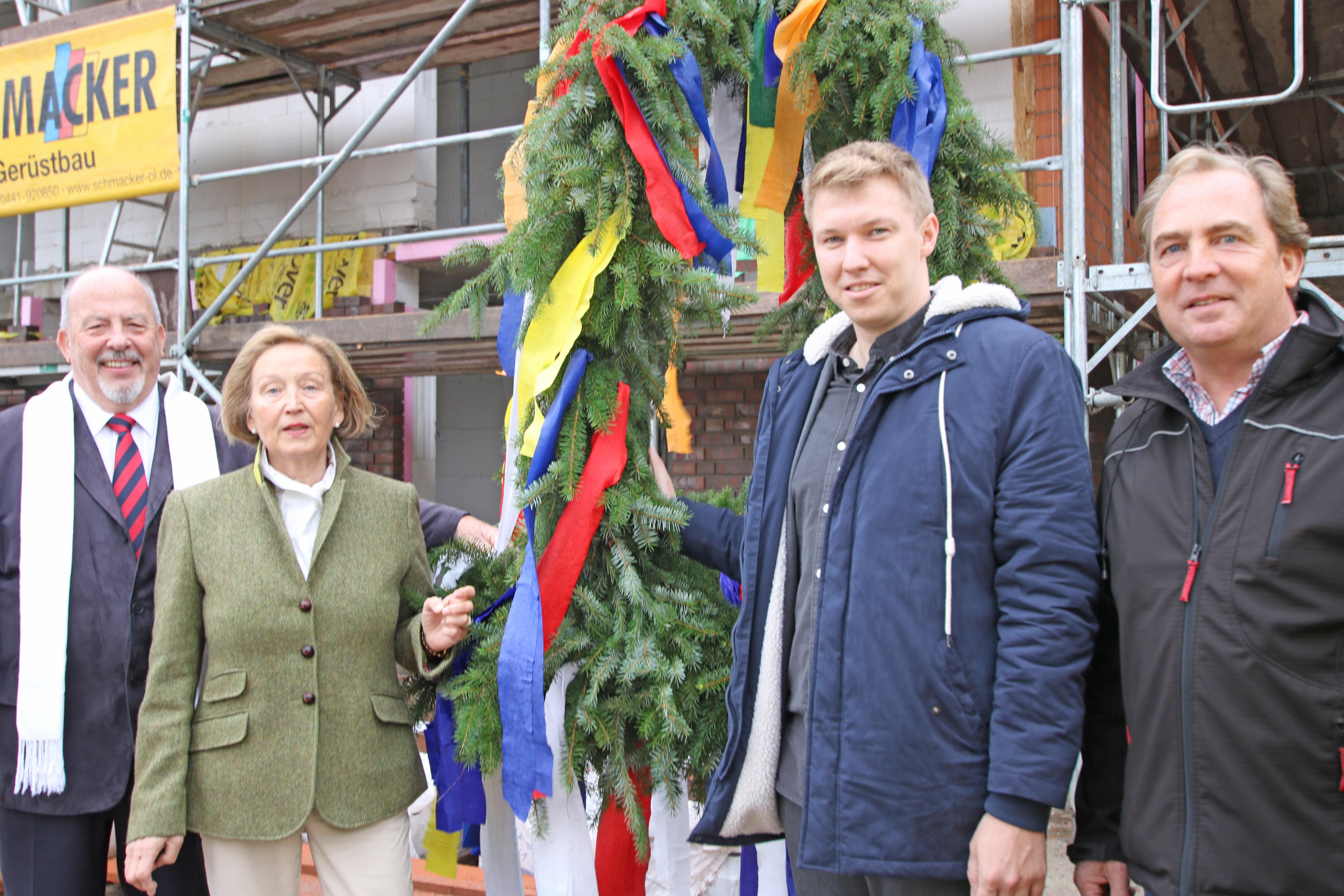 Oldenburg, 11.Okt. 2017 - Gleichzeitig mit der Errichtung der Krone über dem Rohbau des neuen Wohngebäudes feiert das Elisabethstift sein 128jähriges Jahresfest. Das Elisabethstift baut auf dem Gelände der ehemaligen Altenpflegeschule, Familienbildungsstätte und Erwachsenenbildung 10 Seniorenwohnungen in der Größe von ca. 50 qm. Das zweieinhalbstöckige Gebäude wird eine Fahrstuhl bekommen, mit dem auch die Keller zu erreichen sind. Die Wohnungen in der Nachbarschaft der Altenpflegeeinrichtungen Friedas-Frieden-Stift und Elisabethstift sind seniorengerecht geplant. Eine Wohnung ist vollständig rollstuhlgerecht angelegt. Vor dem Wohngebäude an der Haareneschstraße 58a wird noch ein Gebäude mit je ca. 150 qm Praxis- und Büroräumen gebaut, erklärt die Vorstandsvorsitzende des Elisabethstiftes, Rita Szaszi. Insgesamt wendet der Verein des Diakonissenmutterhauses 2,2 Millionen Euro auf, um die beiden Gebäude mit einem Sockelgeschoss aus heimischem Klinker zu errichten. Oben werden die Häuser mit einer Putzfassade versehen, die Dächer werden begrünt und erhalten eine Solaranlage. Zusammen weisen die Gebäude eine Nutzfläche von 800 qm auf. Wohnungen, Praxis- und Büroräume werden durch das Elisabethstift vermietet. Den Bau entworfen und die Ausführung geplant hat der Bereich Architektur im Diakonie Service-Zentrum Oldenburg (DSO). Der Generalbauunternehmer Hoff und Partner GmbH aus Gronau errichtet beide Gebäude. Die Fertigstellung ist für April 2018 geplant. Die Andacht zum Richtfest und zum Jahresfest hält Vorstand Pastor Werner Könitz. Er empfahl, die neuen Häuser nach der ersten Oberin des Elisabethstiftes, Ida Siebel, zu benennen. Auf diese Weise könne deutliche werden, in welcher Tradition das Elisabethstift den Neubau sehe. Ida Siebel stand der Lebens- und Dienstgemeinschaft der Diakoniessen ab 1899 für 21 Jahre vor. Mit den Diakonissen haz sie sich für alte und pflegebedürftige Menschen engagiert, die Kranken- und Altenpflege professionalisiert und sich für die Reduzierung der Arbeitszeit in der Pflege eingesetzt. Mit dem Neubau am ehemaligen Ruheort der Schwestern entstehe ein Haus, an dem sich Menschen in späteren Lebensabschnitten wohl fühlen werden.