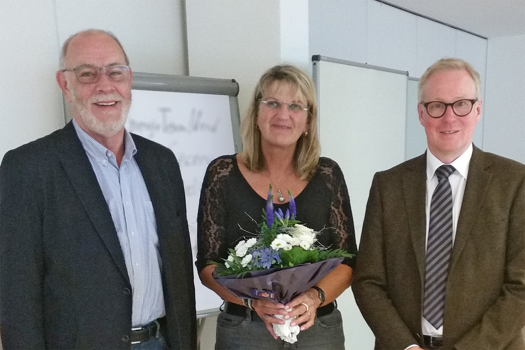 Oldenburg, 16.08.2016 - Soziale Arbeit wie die Wohnungslosenhilfe braucht die Unterstützung von Mitarbeitenden im Schreibdienst und der Verwaltung. Referent Theo Lamge (li.) und Diakonie-Vorstand Thomas Feld (re.) dankten Birgit Hass jetzt im Rahmen einer Dienstbesprechung der Ambulanten Wohnunglosenhilfen im Oldenburger Land für 25 Jahren Mitarbeit im Diakonischen Werk.