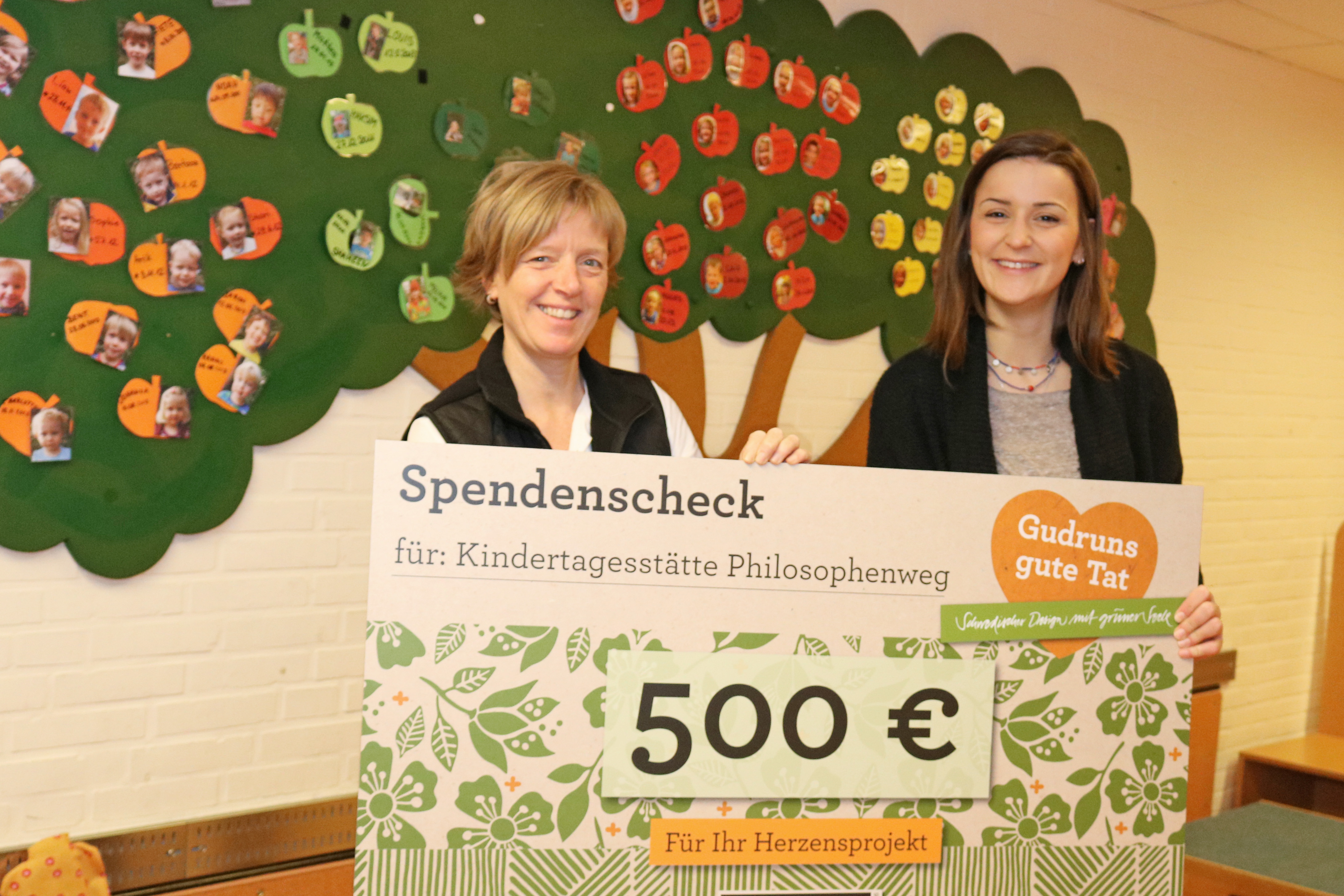 Oldenburg, 15.12.2016 – Die Modefirma Grudrun Sjörden hat sich mit einem mobilen Konzeptladen auf eine Tour durch West- und Norddeutschland begeben. Während dieser Tour unterstützt die Firma acht soziale Einrichtungen unter dem Motto „Gudruns Gute Tat – Wir verschönern Ihr Herzensprojekt“. Mitarbeitende der integrativen Kindertagesstätte waren auf die Aktion aufmerksam geworden und hatten sich beworben, um einen Ruheraum für Kinder mit Beeinträchtigungen auszustatten. Jetzt überreichte Jacqueline Wusthoff den Betrag von 500 Euro an Einrichtungsleiterin Astrid Brundiers.