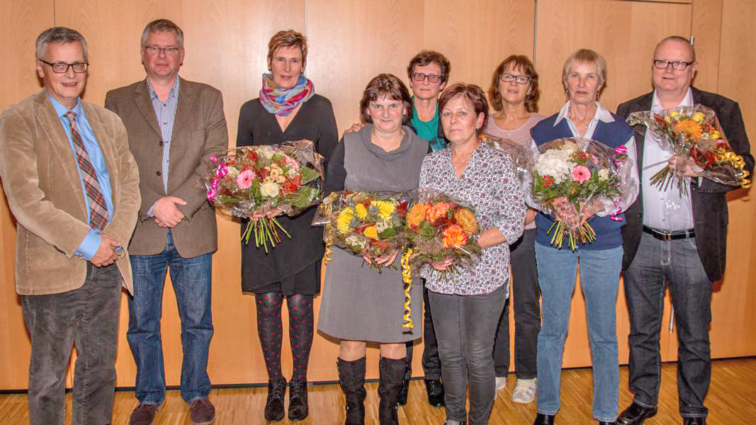 Esens, 01.12.2016 - Zur diesjährigen Jubilarfeier überbrachten der Geschäftsführer des Evangelischen Seniorenzentrums Peter-Friedrich-Ludwig-Stift, Uwe Kollmann (v.l.), Prokurist Axel Stellmann und die Mitarbeitervertreterin Angela Iwanow (3. v. re.) Blumen und Urkunden. Uta Fischer (v.li.) ist seit 25 Jahren dabei, Margret Hoffrogge seit 10 Jahren, Margret Meinen seit 20 Jahren, Halina Breska ebenfalls seit 10 Jahren, Elke Meyer seit 20 Jahren und Joachim Pilger seit 10 Jahren. Krankheitsbedingt nicht auf dem Bild ist Einrichtungsleiter Christian Cordes. Er ist seit 25 Jahren im Peter-Friedrich-Ludwig-Stift. Kollmann unterstrich die Bedeutung langjähriger Mitarbeiterinnen in diesem nicht einfachen Metier. Er freue sich, dass so viele Mitarbeitende so lange bei der Diakonie blieben. Ihre Identifikation mit der Arbeit, ihr Engagement und ihre Freundlichkeit machten den Wert der guten Rundum-Versorgung im Stift aus.