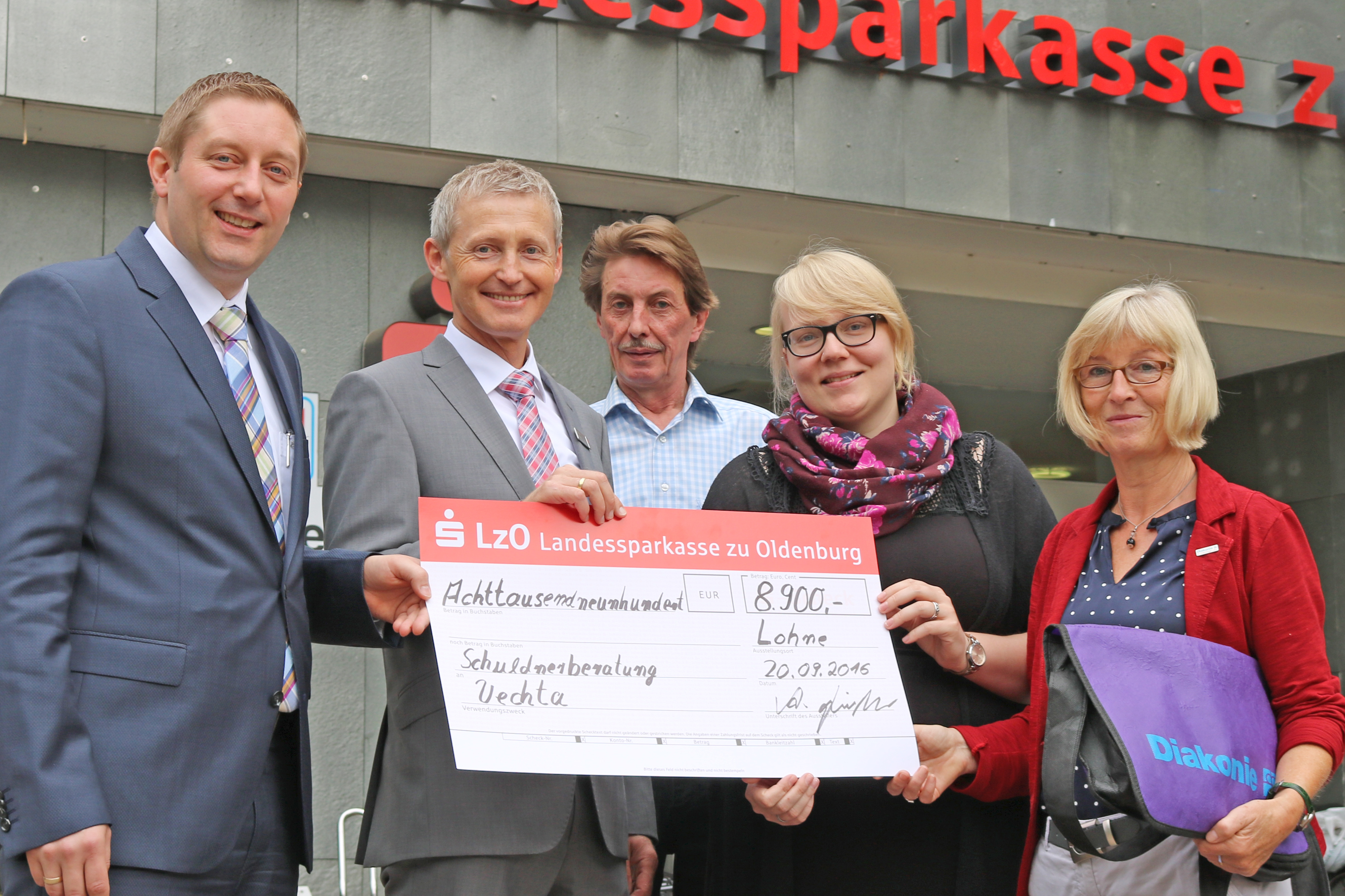 Vechta, 20. Sept. 2016 – Gemeinsam mit dem Sparkassenverband Niedersachsen unterstützt die Landessparkasse zu Oldenburg in diesem Jahr die Schuldnerberatungsstelle des Diakonischen Werkes in Vechta erneut mit einem Betrag von 8.900,- Euro, aus Mitteln des Lotteriespiels „Sparen + Gewinnen“. Hintergrund ist eine langjährige Vereinbarung zwischen den Sparkassen und dem Land Niedersachsen.