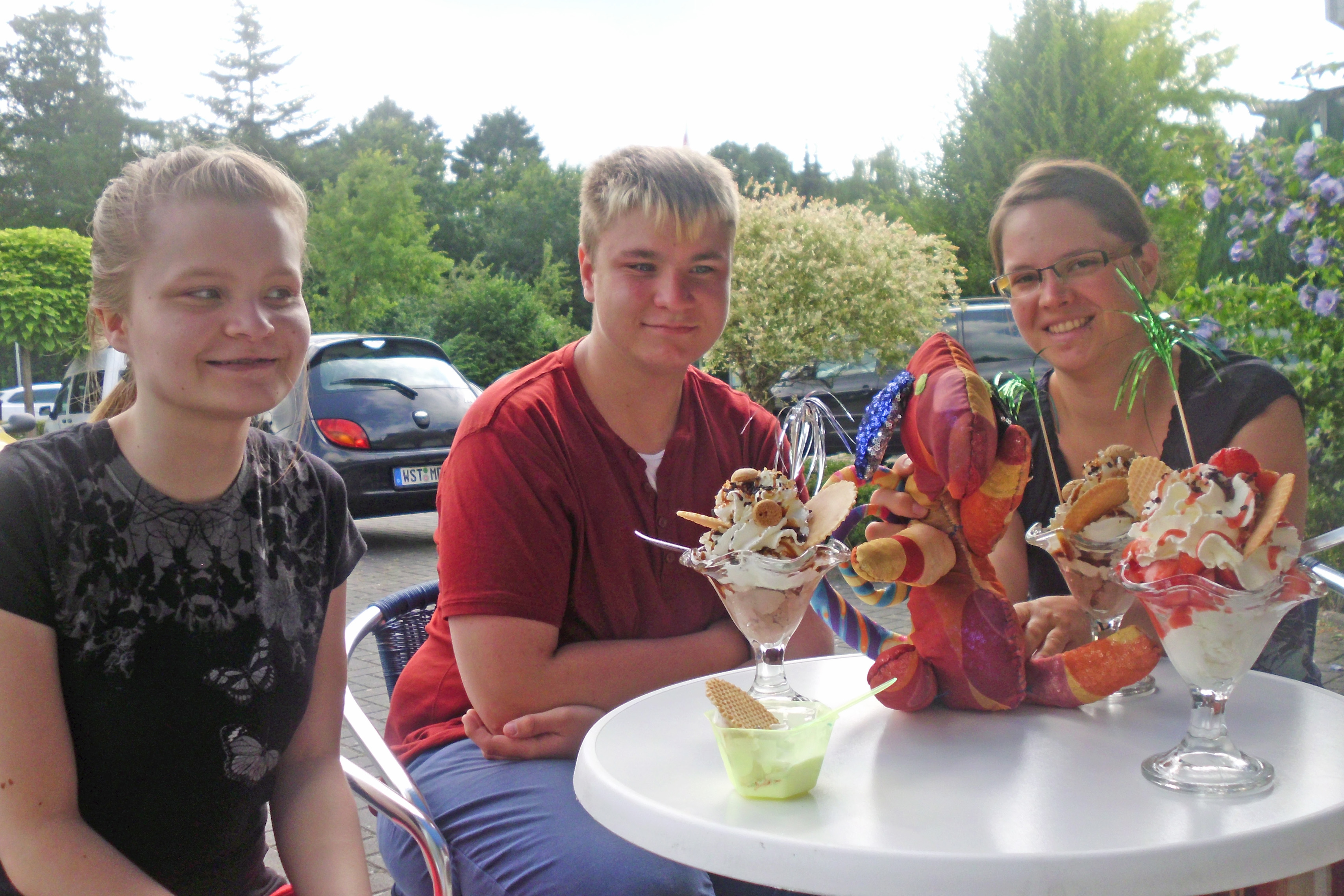 Oldenburg, 05.08.2016 – Zu einem bunten Nachmittag trafen sich jetzt Lisa Willems, Jerome Lietz und Laura Butkereit. Die Praktikantin und Schüler der Förderschule Kleiststraße hatten das Maskottchen für Kiola in einem Wettbewerb entwickelt. Mit der Einladung zu einem bunten Nachmittag konnte sich die Initiative jetzt bei den Jugendlichen für den Entwurf bedanken.