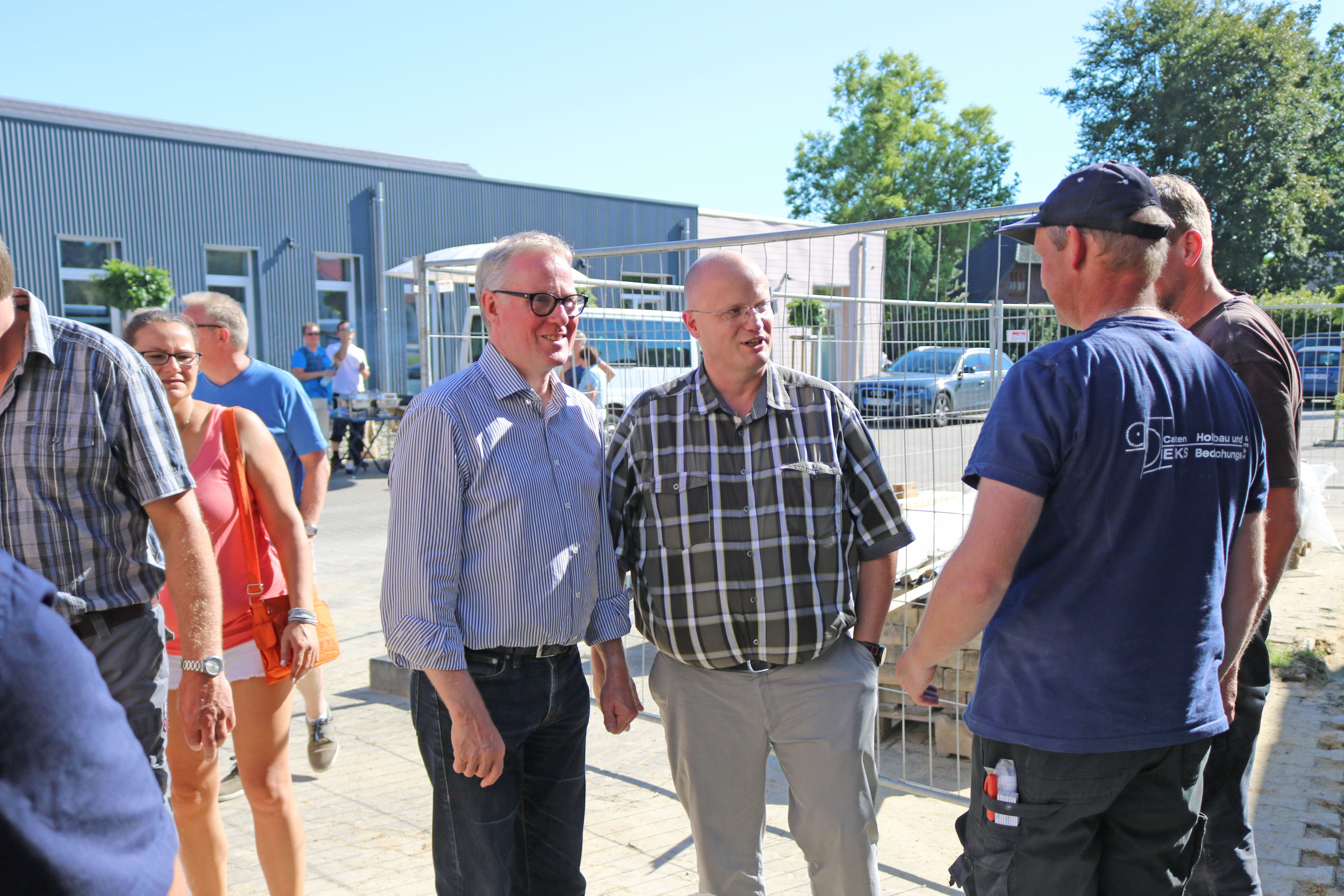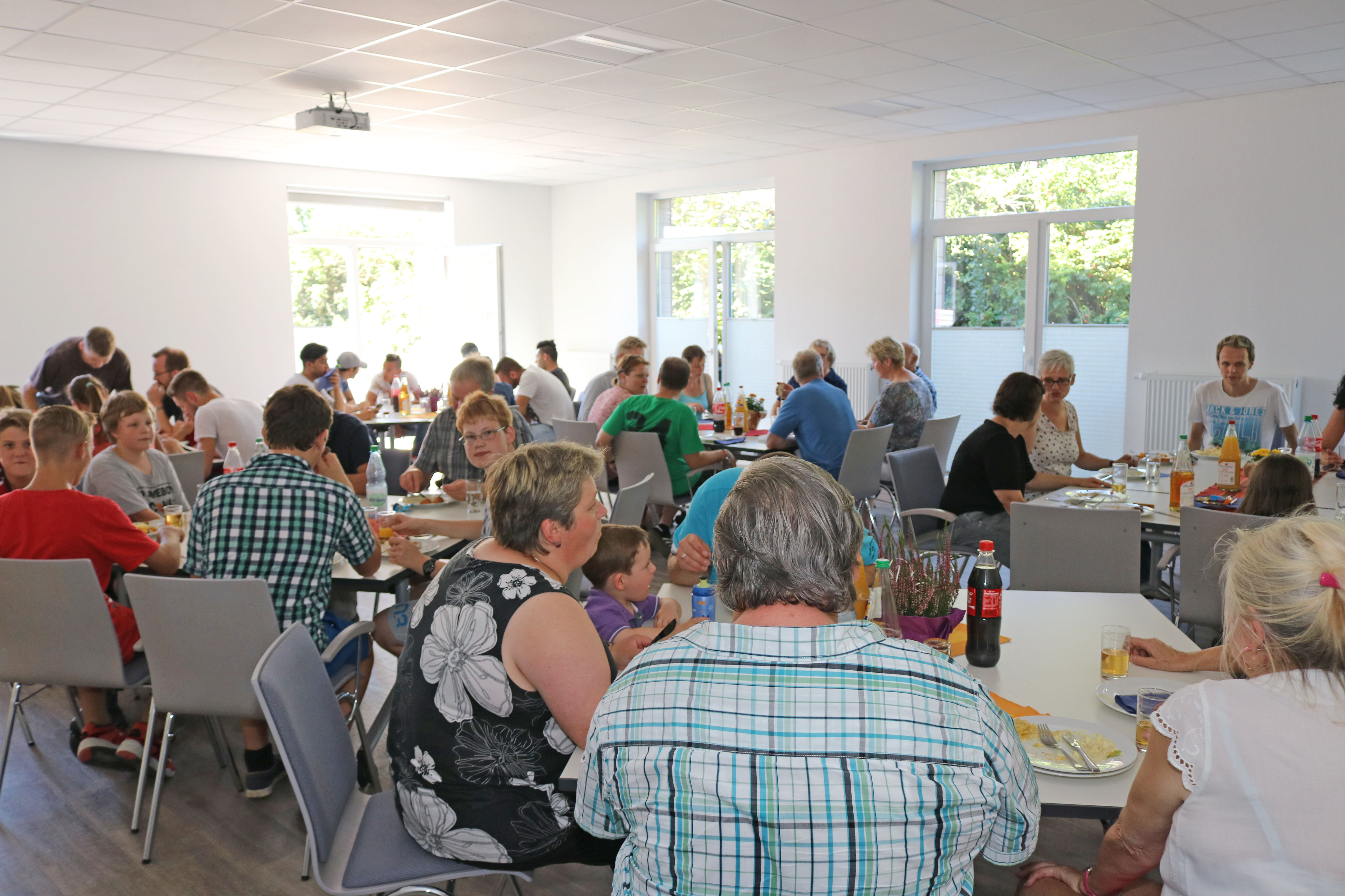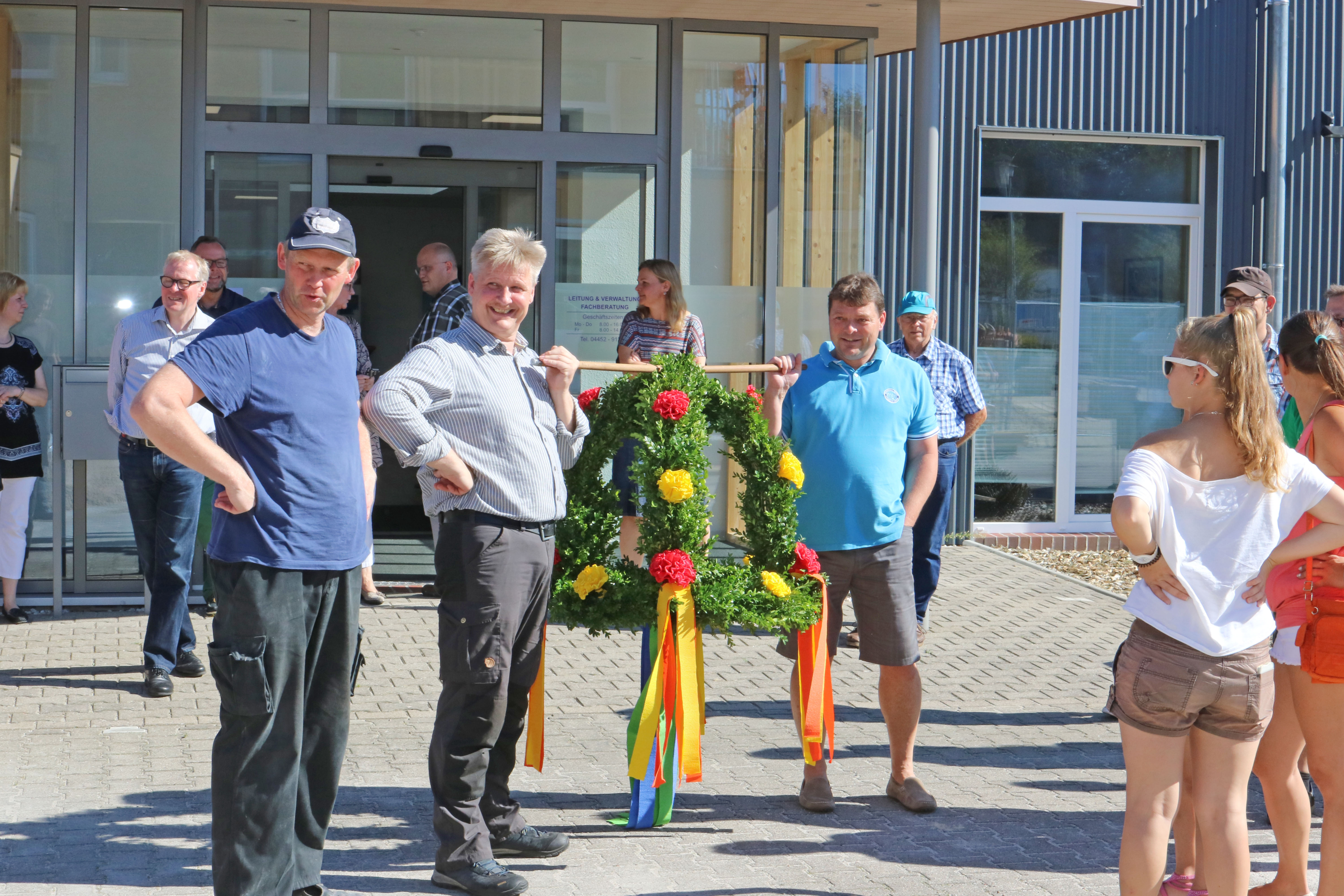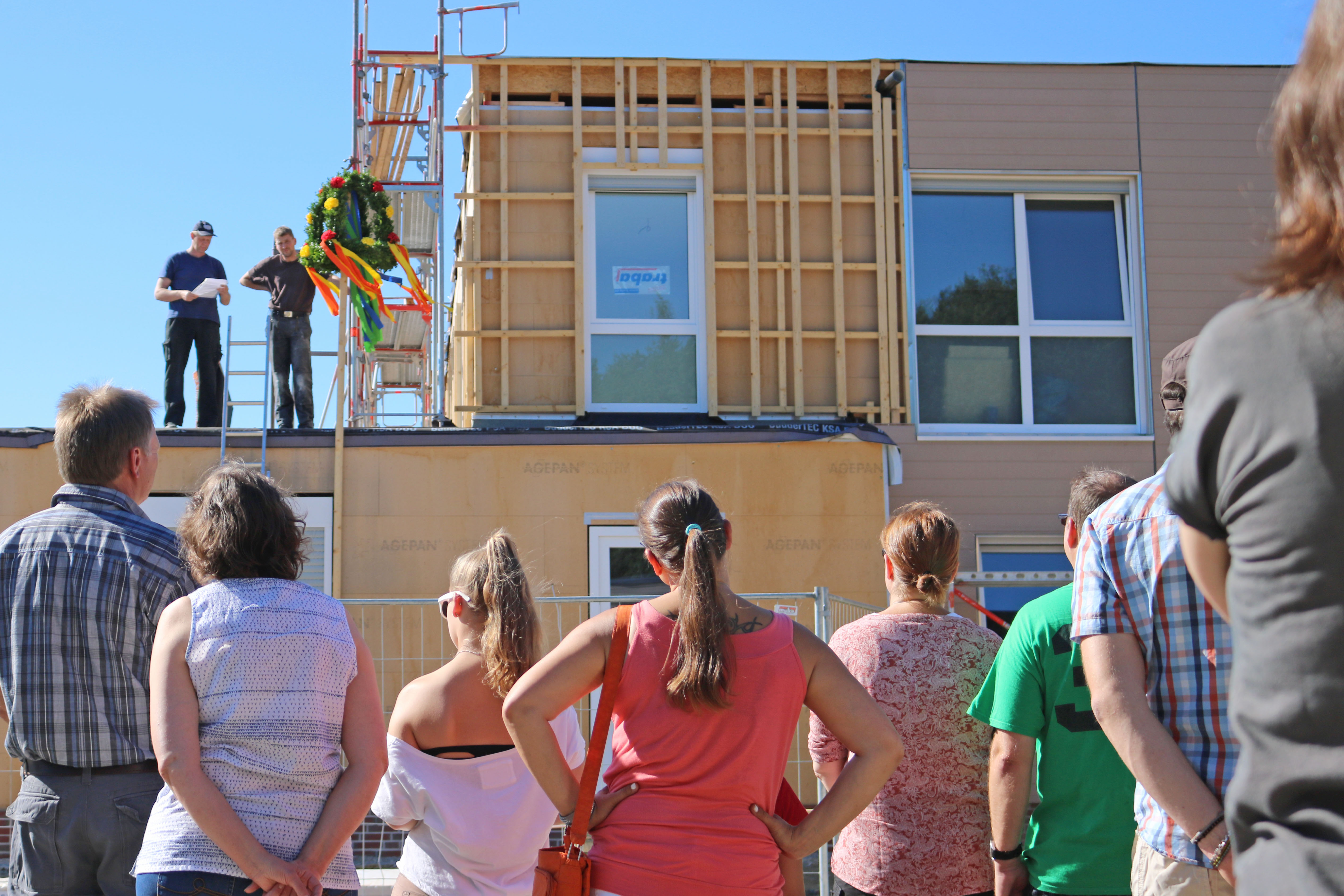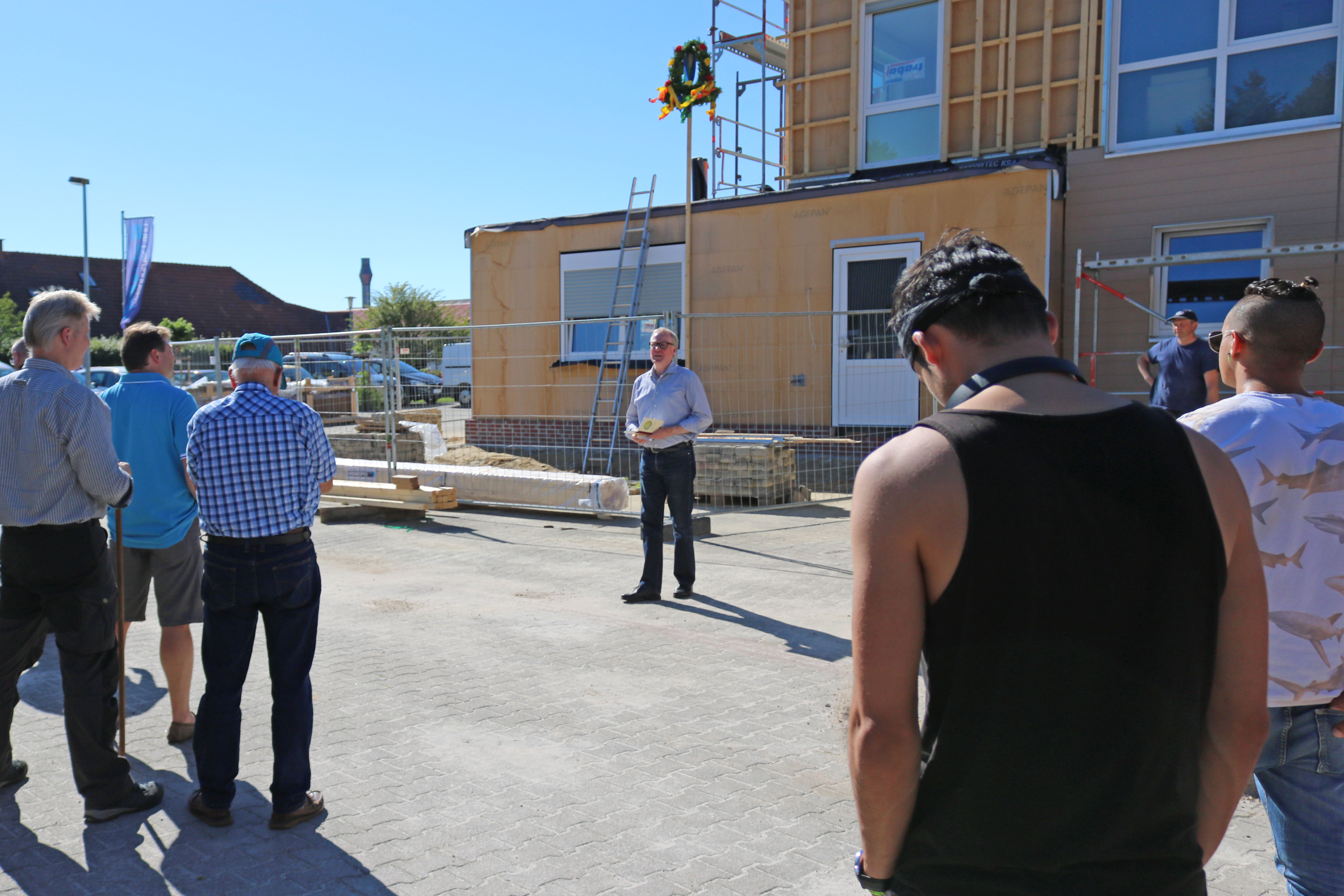 Bockhorn, 26. Aug. 2016 - Den Baufortschritt des Wohnheimes für unbegleitete minderjährige Ausländer feierte jetzt die Diakonie-Jugendhilfe in Bockhorn. Nachbarn überbrachten die traditionelle Richtkrone, Handwerker sprachen die dabei üblichen Worte und Diakonie-Vorstand Thomas Feld segnete den Bau. Bei dem Fest haben die künftigen Bewohner der Einrichtung Nachbarn kennen gelernt und deutsche Kultur erlebt. Bei der Begehung des weit fortgeschrittenen Rohbaus überlegten die Jugendlichen bereits, wer später in welches Zimmer einziehen kann, berichtet Betreuuer Ole Martens. Die Jugendlichen freuen sich über Platz und Größe ihrer künftigen Wohnung. Träger Diakonie-Jugendhilfe Collstede hatte Nachbarn, Mitarbeitende, Vertreter des Kirchenkreises in das gegenüber liegende Verwaltungsgebäude eingeladen, zusammen zu sitzen und zu feiern. Vor dem Haus bollerte der Grill. Nur zwei Details unterschieden das Fest von anderen Richtfeiern: Es gab Würstchen mit Hühnerfleisch und das Bier war alkoholfrei.