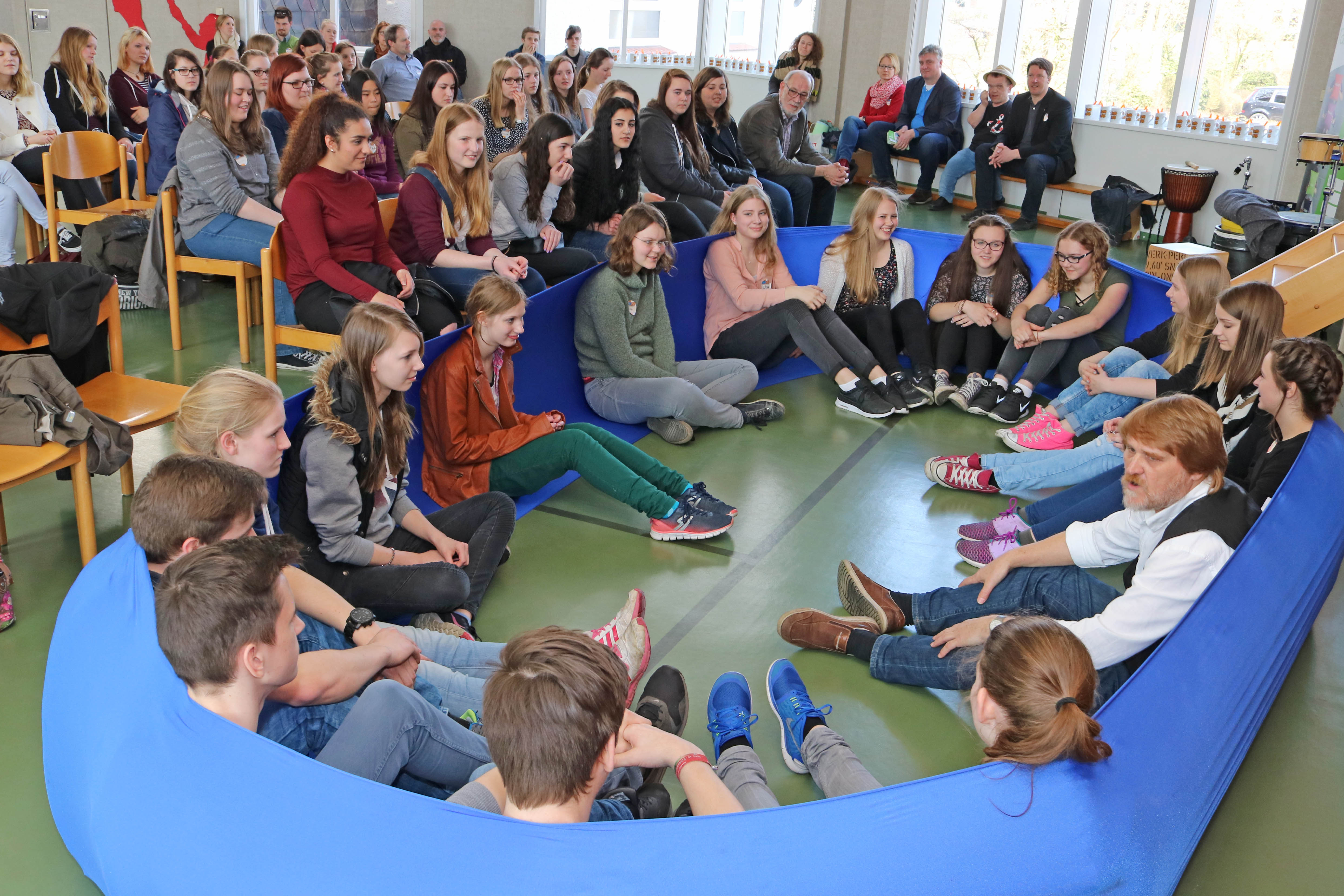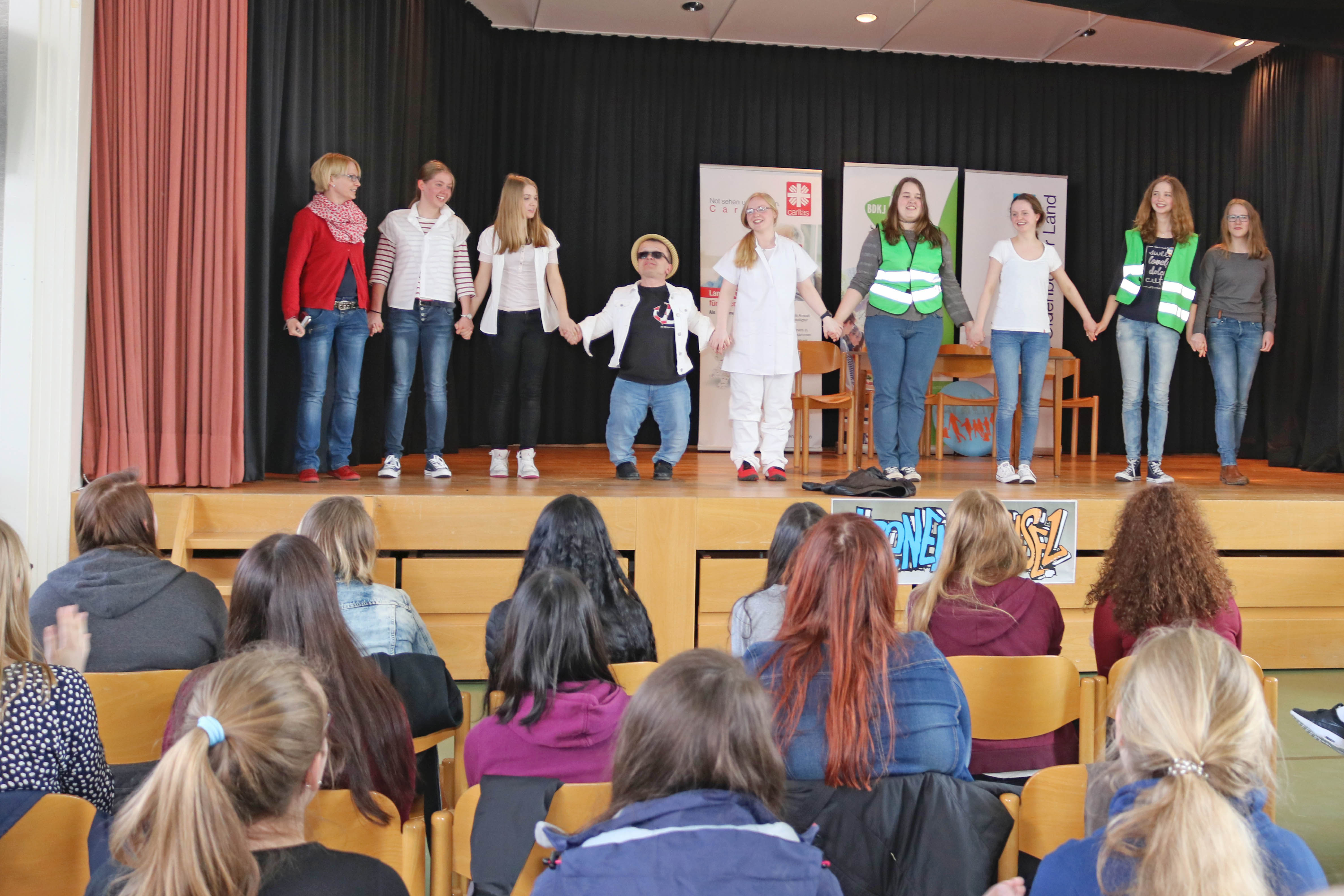 Vechta, 03. April 2016 – Mit kleinen Spielszenen haben Szenenwechsler ihre Erfahrungen im Sozialpraktikum von Caritas und Diakonie reflektiert. Dabei konnten sie von der Bühnenerfahrung des Szenenwechsel-Schirmherrn Manni Laudenbach profitieren. Bei der Abschlussveranstaltung in der Berufsbildenden Schule Marienhain Vechta haben sich die Jugendlichen zwischen 15 und 21 Jahren in regionalen Kleingruppen über ihre Erlebnisse beim Kurzpraktikum ausgetauscht. Alle Teilnehmende gingen mit einem Zertifikat und dem guten Gefühl nach Hause, in den Osterferien etwas Sinnvolles getan zu haben. Die meisten der 123 Teilnehmenden fanden das soziale Schnupperpraktikum so gut, dass sie anderen empfehlen, beim nächsten Szenenwechsel dabei zu sein.