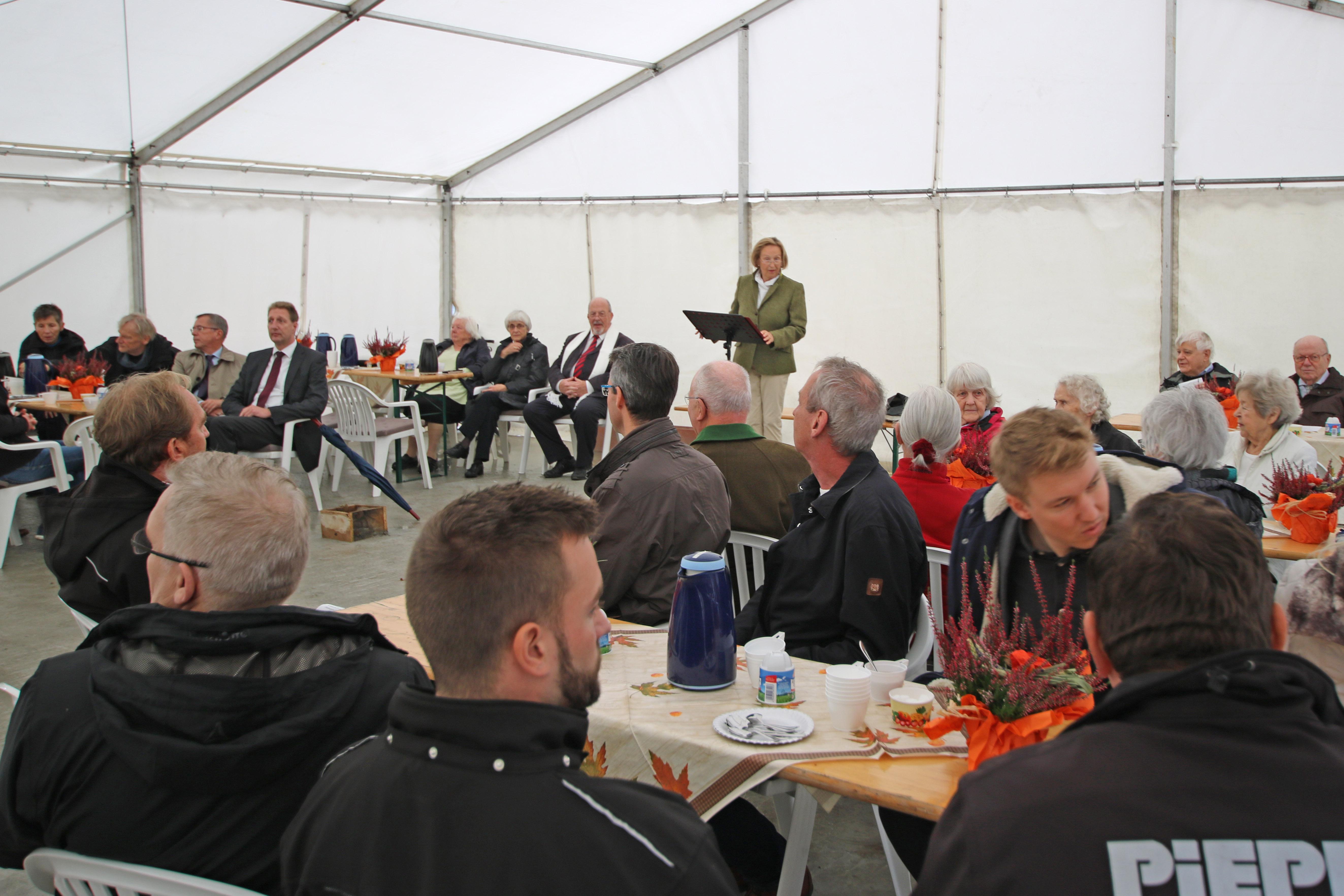 Oldenburg, 11.Okt. 2017 - Gleichzeitig mit der Errichtung der Krone über dem Rohbau des neuen Wohngebäudes feiert das Elisabethstift sein 128jähriges Jahresfest. Das Elisabethstift baut auf dem Gelände der ehemaligen Altenpflegeschule, Familienbildungsstätte und Erwachsenenbildung 10 Seniorenwohnungen in der Größe von ca. 50 qm. Das zweieinhalbstöckige Gebäude wird eine Fahrstuhl bekommen, mit dem auch die Keller zu erreichen sind. Die Wohnungen in der Nachbarschaft der Altenpflegeeinrichtungen Friedas-Frieden-Stift und Elisabethstift sind seniorengerecht geplant. Eine Wohnung ist vollständig rollstuhlgerecht angelegt. Vor dem Wohngebäude an der Haareneschstraße 58a wird noch ein Gebäude mit je ca. 150 qm Praxis- und Büroräumen gebaut, erklärt die Vorstandsvorsitzende des Elisabethstiftes, Rita Szaszi. Insgesamt wendet der Verein des Diakonissenmutterhauses 2,2 Millionen Euro auf, um die beiden Gebäude mit einem Sockelgeschoss aus heimischem Klinker zu errichten. Oben werden die Häuser mit einer Putzfassade versehen, die Dächer werden begrünt und erhalten eine Solaranlage. Zusammen weisen die Gebäude eine Nutzfläche von 800 qm auf. Wohnungen, Praxis- und Büroräume werden durch das Elisabethstift vermietet. Den Bau entworfen und die Ausführung geplant hat der Bereich Architektur im Diakonie Service-Zentrum Oldenburg (DSO). Der Generalbauunternehmer Hoff und Partner GmbH aus Gronau errichtet beide Gebäude. Die Fertigstellung ist für April 2018 geplant. Die Andacht zum Richtfest und zum Jahresfest hält Vorstand Pastor Werner Könitz. Er empfahl, die neuen Häuser nach der ersten Oberin des Elisabethstiftes, Ida Siebel, zu benennen. Auf diese Weise könne deutliche werden, in welcher Tradition das Elisabethstift den Neubau sehe. Ida Siebel stand der Lebens- und Dienstgemeinschaft der Diakoniessen ab 1899 für 21 Jahre vor. Mit den Diakonissen haz sie sich für alte und pflegebedürftige Menschen engagiert, die Kranken- und Altenpflege professionalisiert und sich für die Reduzierung der Arbeitszeit in der Pflege eingesetzt. Mit dem Neubau am ehemaligen Ruheort der Schwestern entstehe ein Haus, an dem sich Menschen in späteren Lebensabschnitten wohl fühlen werden.