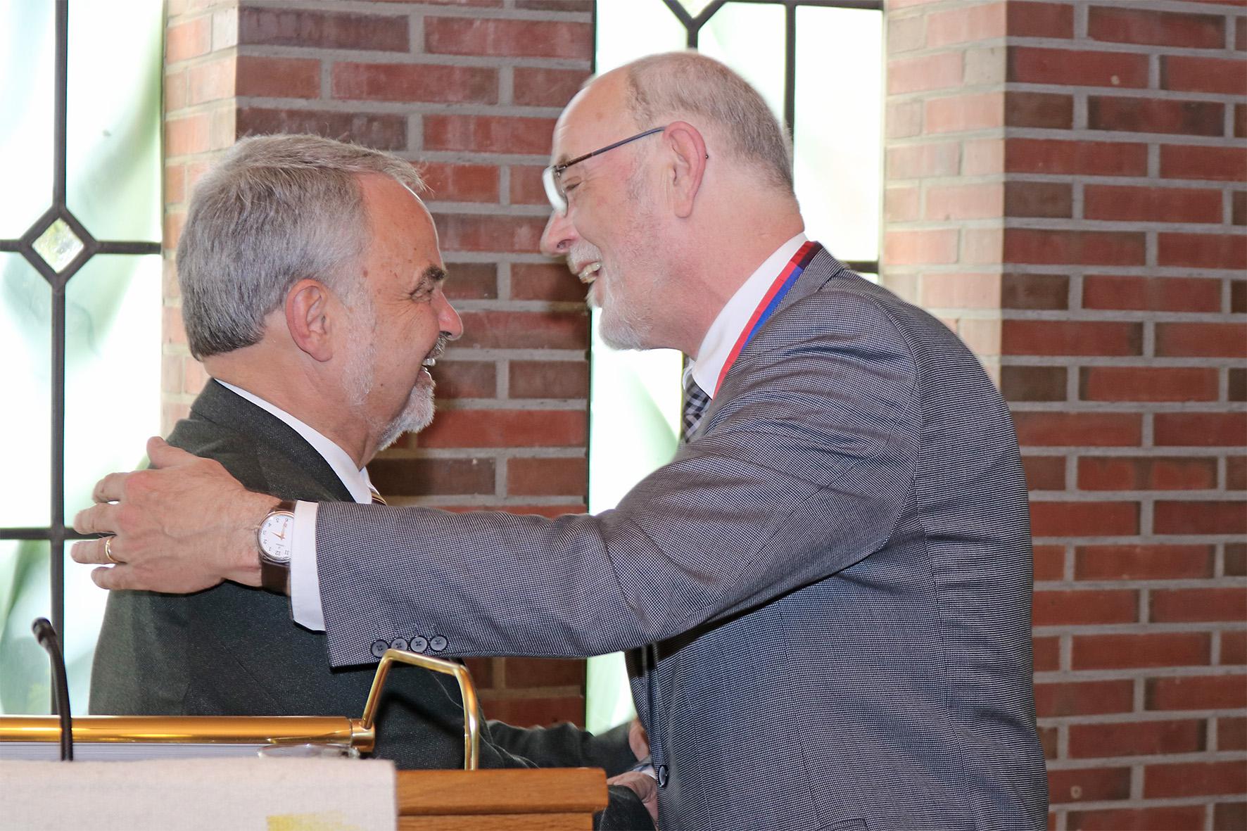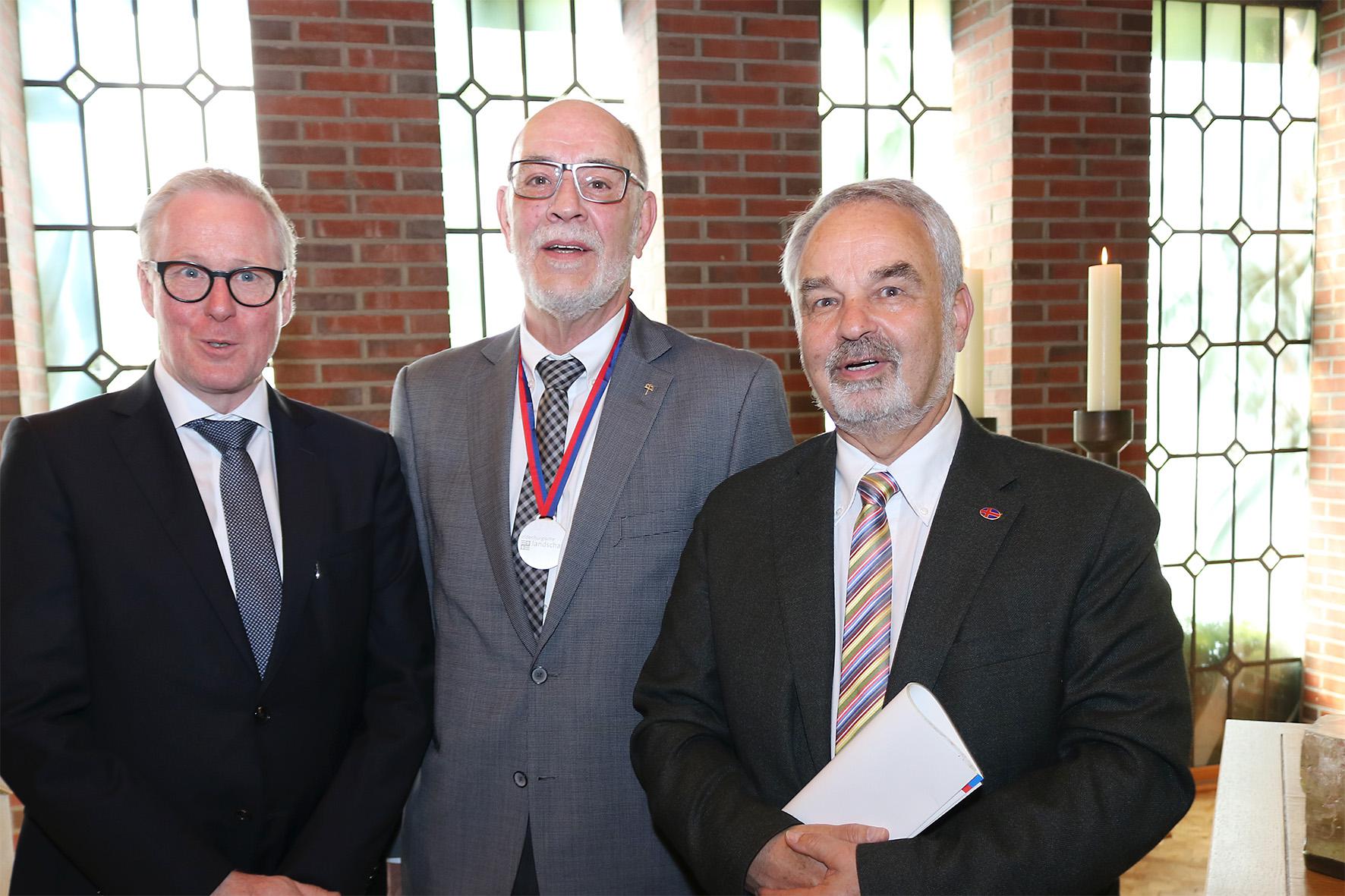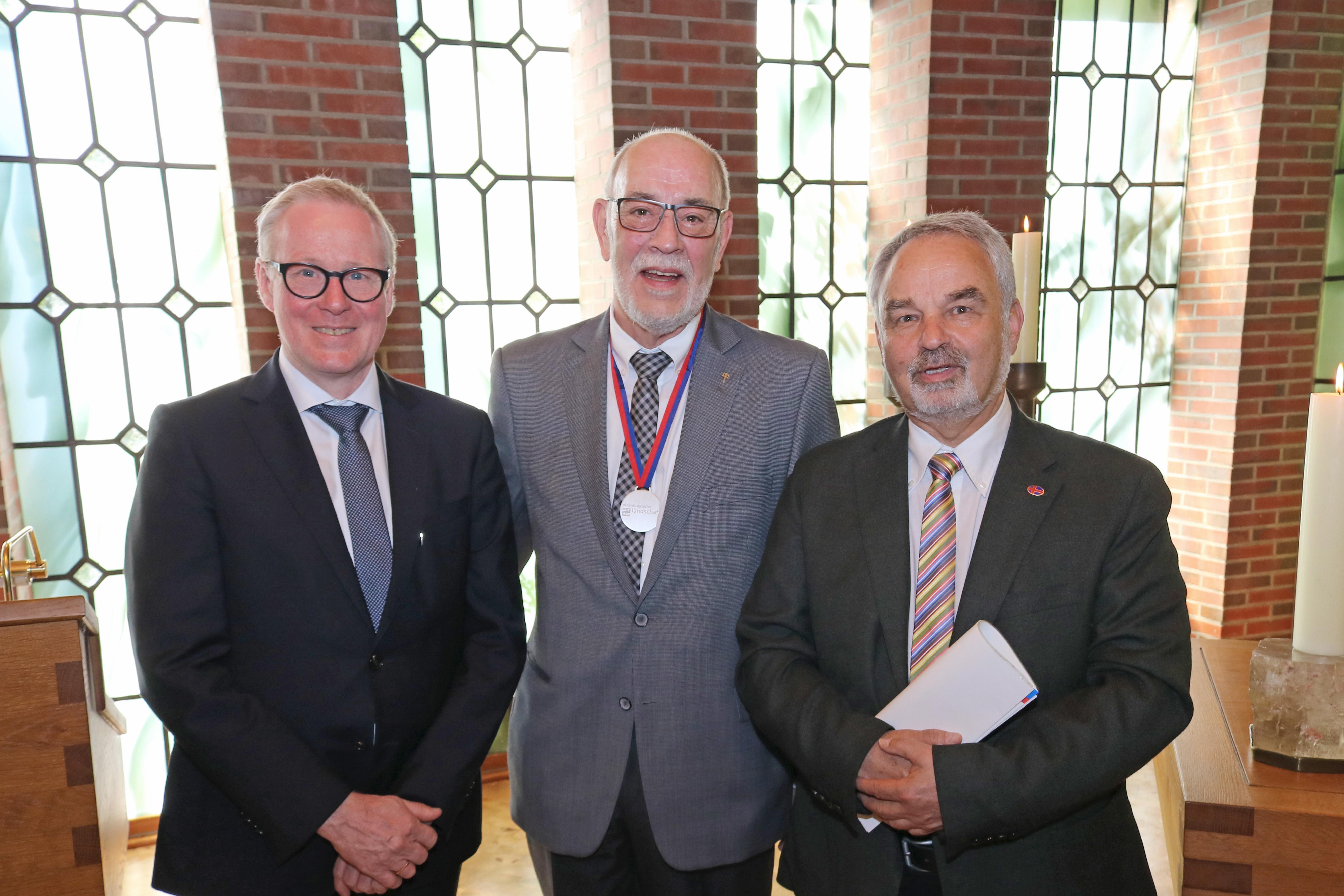 Oldenburg, 17. Mai 2017 - Vor der Diakonischen Konferenz in Oldenburg hat der Präsident der Oldenburgische Landschaft, Thomas Kossendey, dem langjährigen Diakonie-Mitarbeiter und Migrationsfachmann Theo Lampe die Landschaftsmedaille verliehen. Lampe hat sich beinahe vier Jahrzehnte lang in der Diakonie sozial engagiert und sich besonders in der Migrations-, Integrations- und Flüchtlingssozialarbeit große Verdienste erworben.