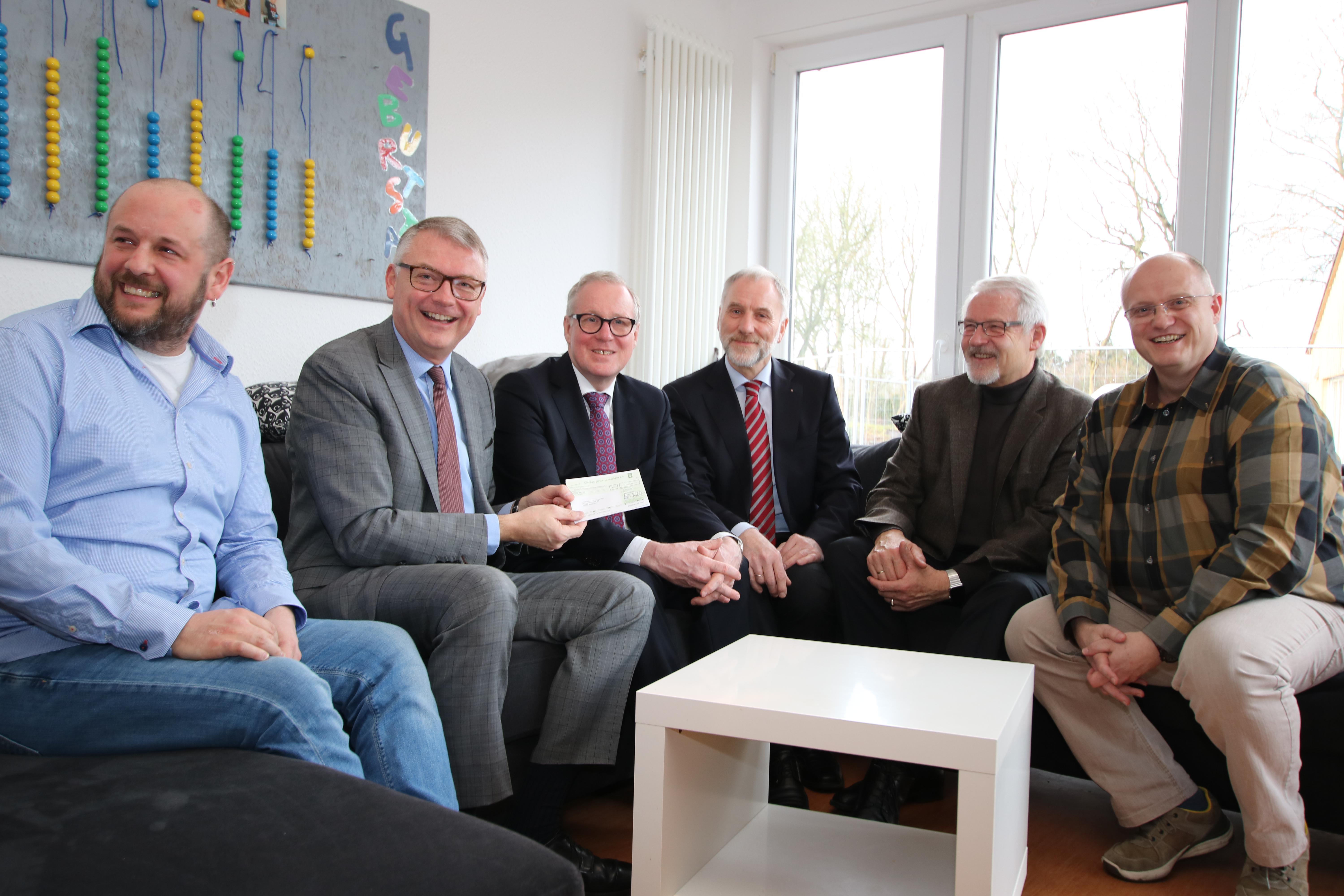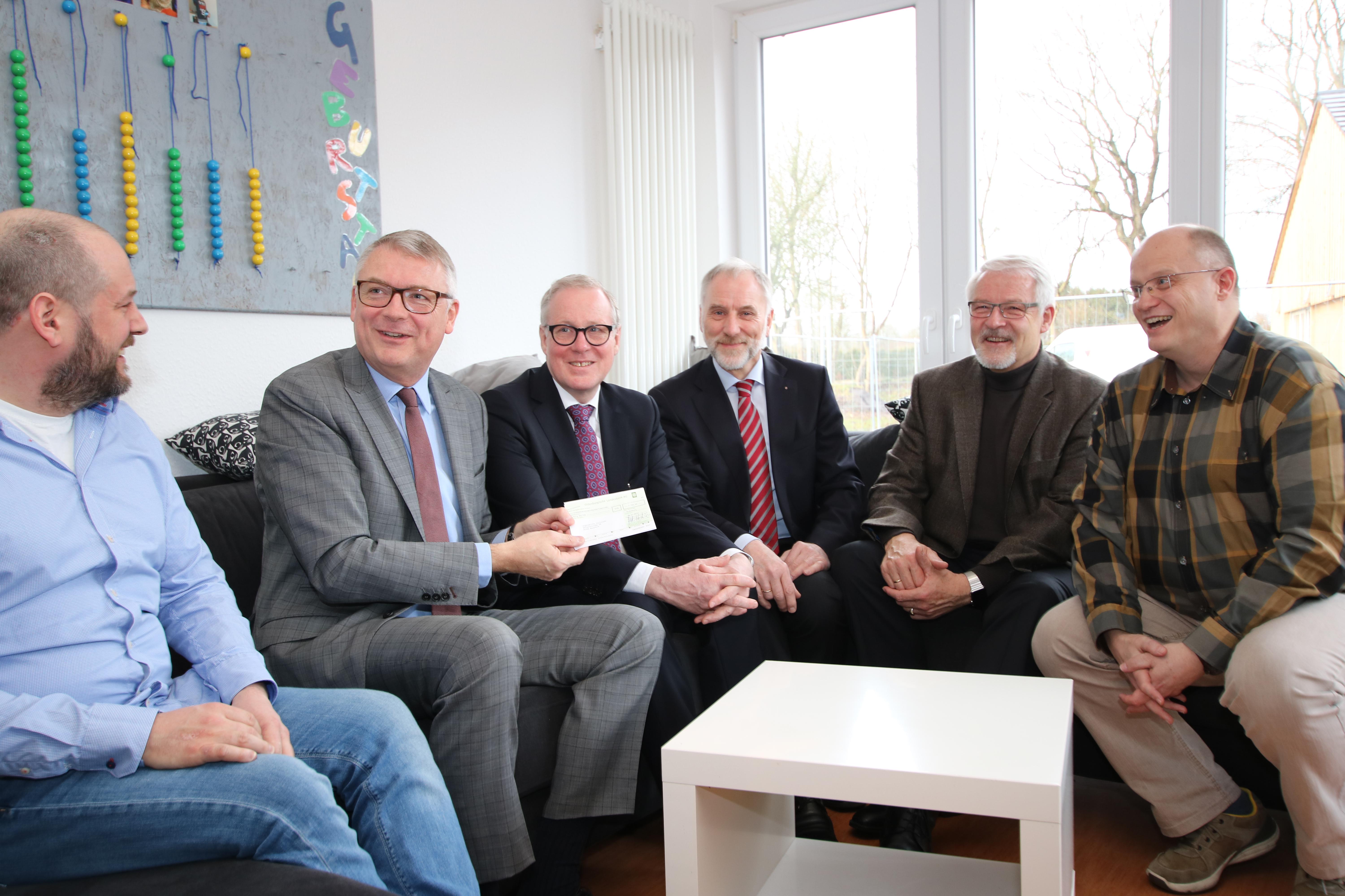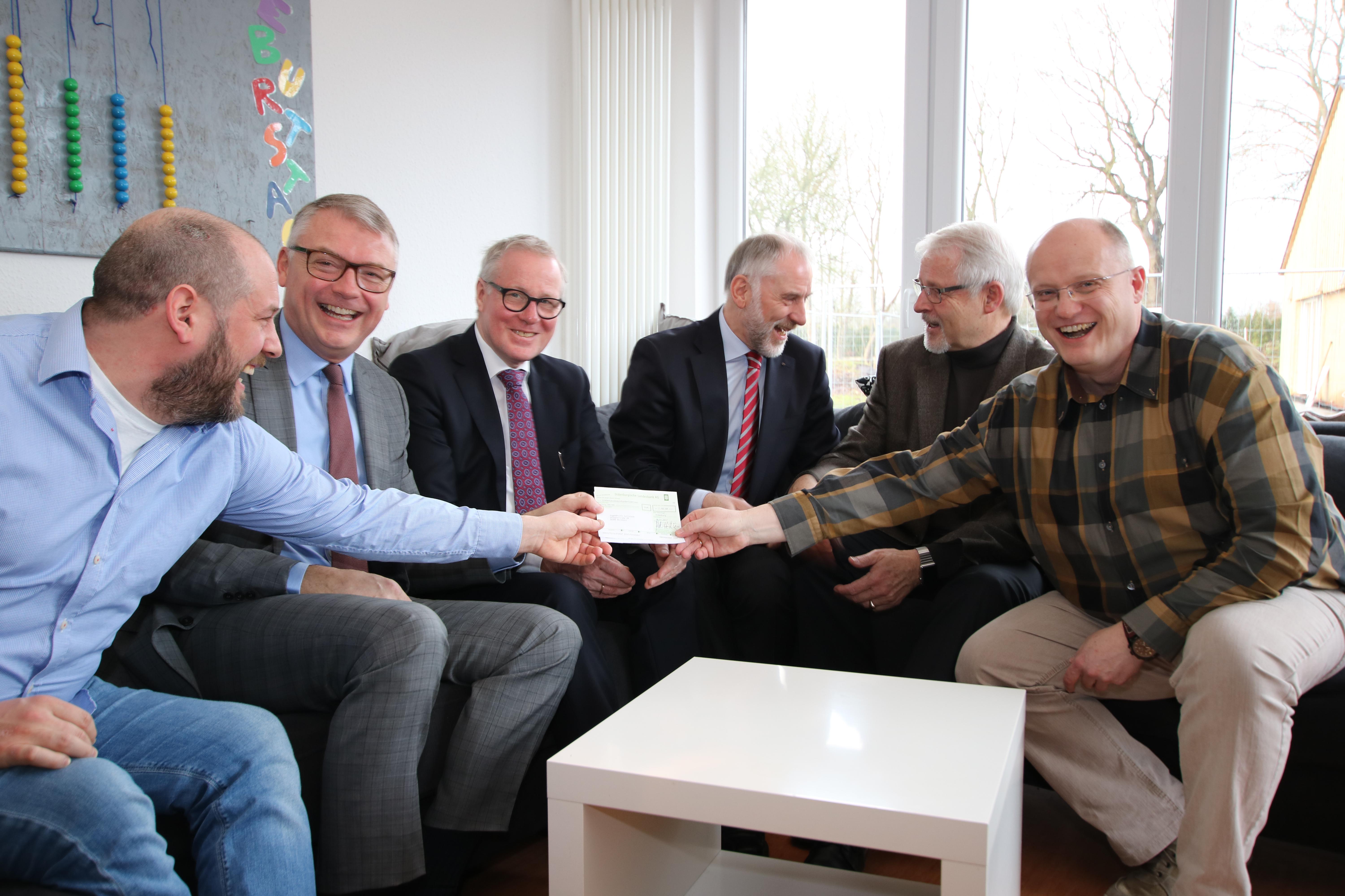 Grabstede, 16. Jan. 2018 – Rund 30.000 Euro hat die Wirtschaftliche Vereinigung der kleine Kreis anlässlich des Schlossabends im Dezember für karitative Zwecke gesammelt. 7.100 Euro haben jetzt Geschäftsführer Jürgen Lehmann und der Vorstand des Kleinen Kreises an die Diakonie-Jugendhilfe Collstede übergeben. Das Geld wird verwendet, um die Außenanlagen der der heilpädagogischen Jungen-Wohngruppe neu zu gestalten. In der von Gruppenleiter Till Waschek liebevoll als Butschergruppe bezeichneten Einrichtung leben zur Zeit sieben Jungen im Alter zwischen 9 und 16 Jahren. Sie brauchen Bewegungsraum und einen Ausgleich zur Schule. Denn die Jungen leben in einer Einrichtung der Jugendhilfe, weil schwierige Lebensumstände zu Hause das erfordern. Oft haben die Eltern um Unterstützung bei der Erziehung gebeten. Manchmal ist der Anstoß, Hilfe zu suchen, von der Schule gekommen. In der heilpädagogischen Jugendgruppe finden die Jungs einen geschützten Raum, in dem sie wachsen und ihre Lebenssituation sortieren können. Der Kontakt zur Herkunftsfamilie wird intensiv gepflegt, berichtet Einrichtungsleiter Jan Praßel. Wenn möglich ziehen die Jungen wieder zu ihren Eltern zurück. Bei den älteren Jugendlichen geht es aber meist um Verselbständigung. Denn mit 18 Jahren läuft die Unterstützung durch die Jugendhilfe aus. Wer bis dahin einen Schulabschluss geschafft und selbständig genug ist, sein Leben in einer eigenen Wohnung zu organisieren, hat gute Perspektiven für die Zukunft, wissen die Pädagogen und Sozialarbeiter der Diakonie.