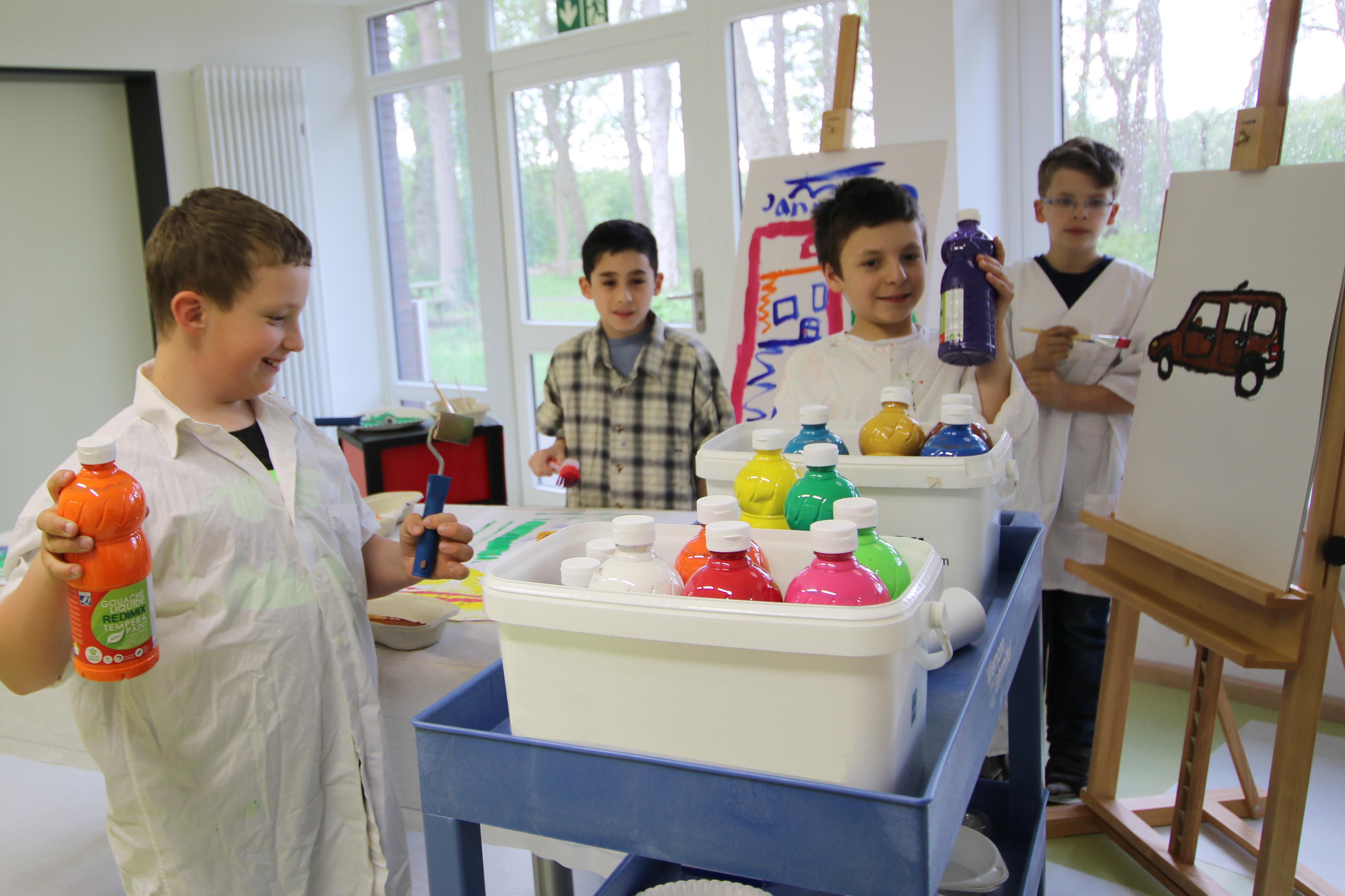 Oldenburg, 26.04.2018 - Mit 5.000 Euro von der Aktion Mensch wurde jetzt ein großer lichtdurchfluteter Raum am Borchersweg als Atelier hergerichtet, Staffeleien und eine Werkbank aufgestellt. Nun können sich die Schüler des pädagogisch-therapeutischen Zentrums während der Nachmittagsbetreuung der Diakonie künstlerisch betätigen. Bildnerische Tätigkeit stärkt das Selbstvertrauen von jungen Menschen, weil Beeinträchtigen für die Zeit des kreativen Tuns in den Hintergrund treten. Viele sind stolz, ihre Ergebnise vorzeigen zu können. So auch Pascal, Jannik, Batikan und Nikita. Sie konnten den neuen Kunstraum jetzt das erstmals nutzen.