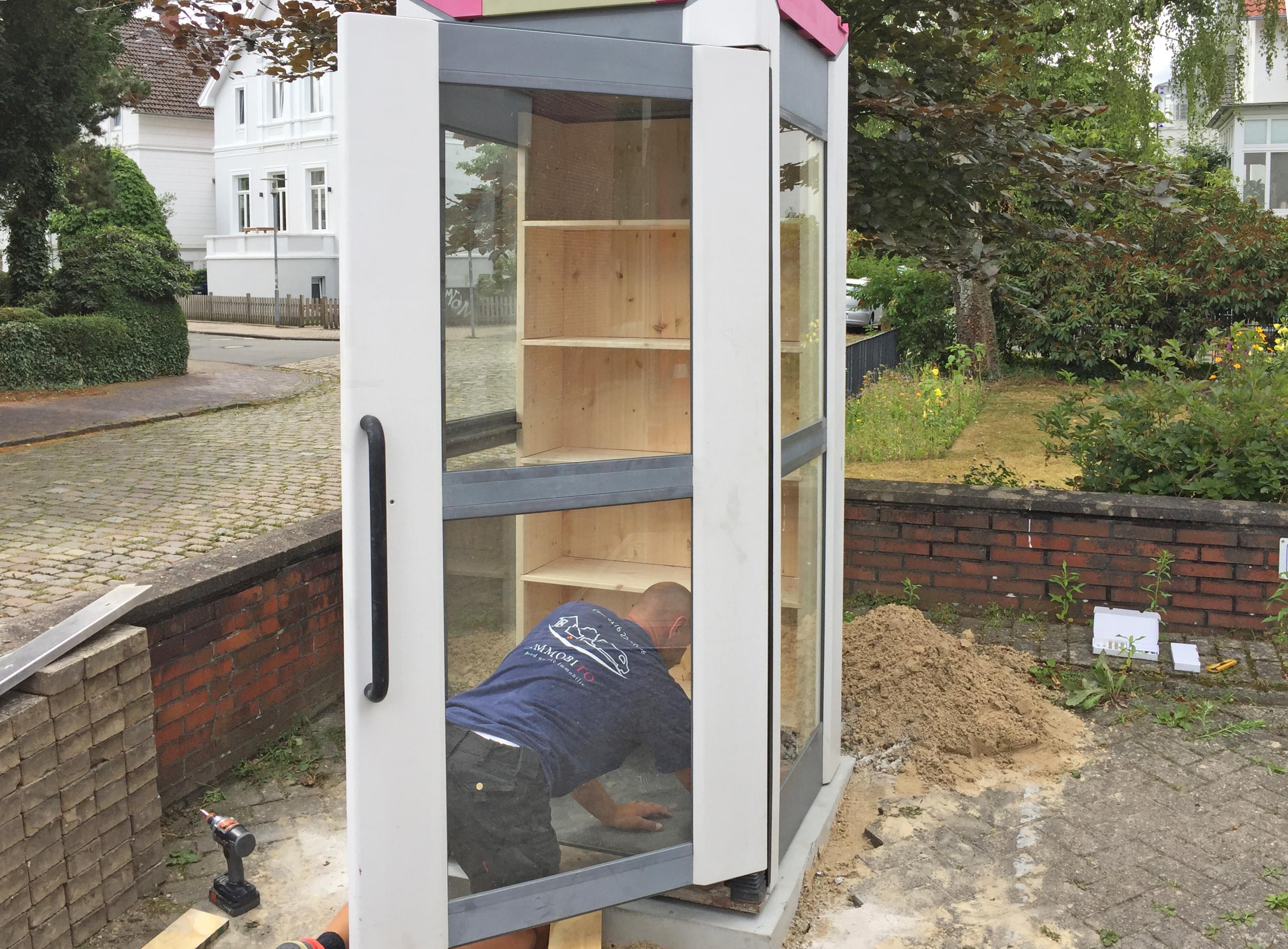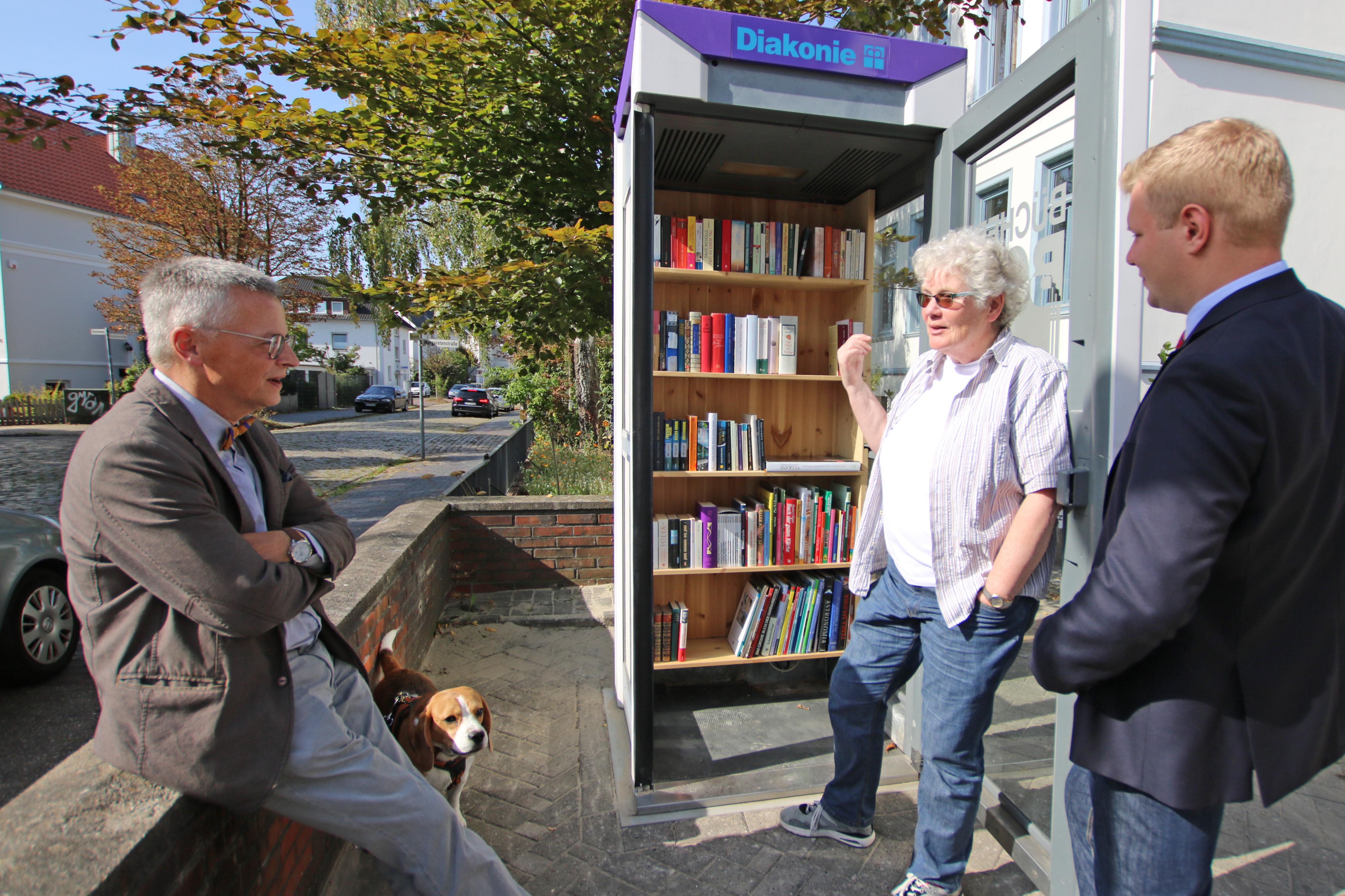 Oldenburg, 19.09.2018 – Auf Anregung von Anwohnerin Ulla Meyer hat die Diakonie eine gebrauchte Telefonzelle erworben und als Büchertauschbox eingerichtet. Diakonie-Vorstand Uwe K. Kollmann hat den bisher ungenutzten Platz am Bürgersteig zur Kastanienallee gerne für das Bücherbox-Projekt freigegeben. Die Diakonie hat die Kosten von rund 3.500 Euro für den Kauf, die Aufstellung und die Einrichtung der Bücherbox übernommen und die Zelle mit Licht ausstatten lassen. Dann können Anwohner, Besucher und Mitarbeitende auch in der kommenden dunklen Jahreszeit Bücher tauschen, erklärt der Assistent des Vorstandes, Benjamin Wehage. Die Bücherbox wird ganztags offen bleiben, kündigt Kollmann an. Wir werden die Bücherbox vor unserer Tür natürlich im Auge behalten. Aber auch Ulla Meyer hat sich vorgenommen, regelmäßig nach dem Rechten zu sehen. Denn die Bücherbox soll sich als attraktive Tauschmöglichkeit vor dem Haus der Diakonie etablieren.