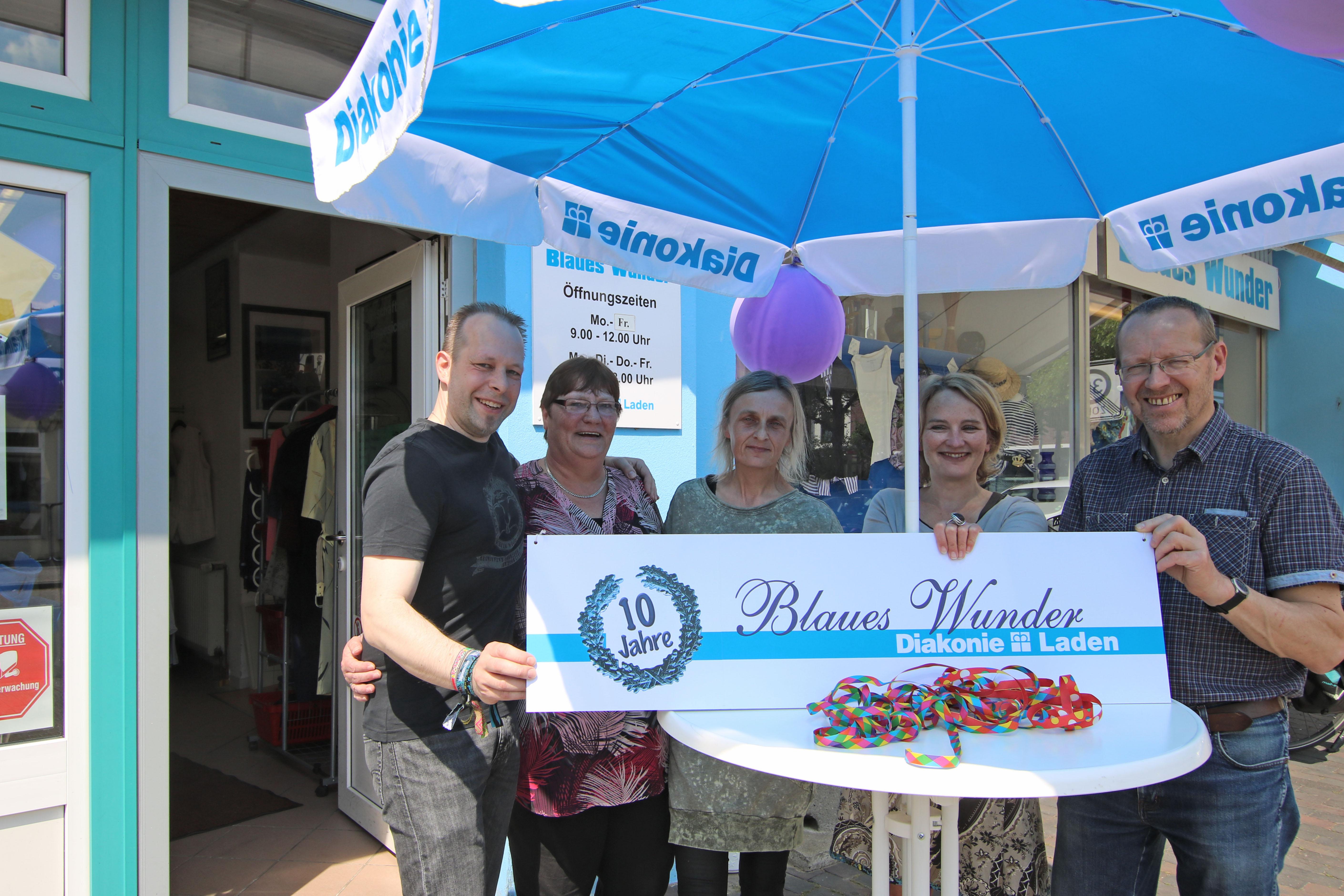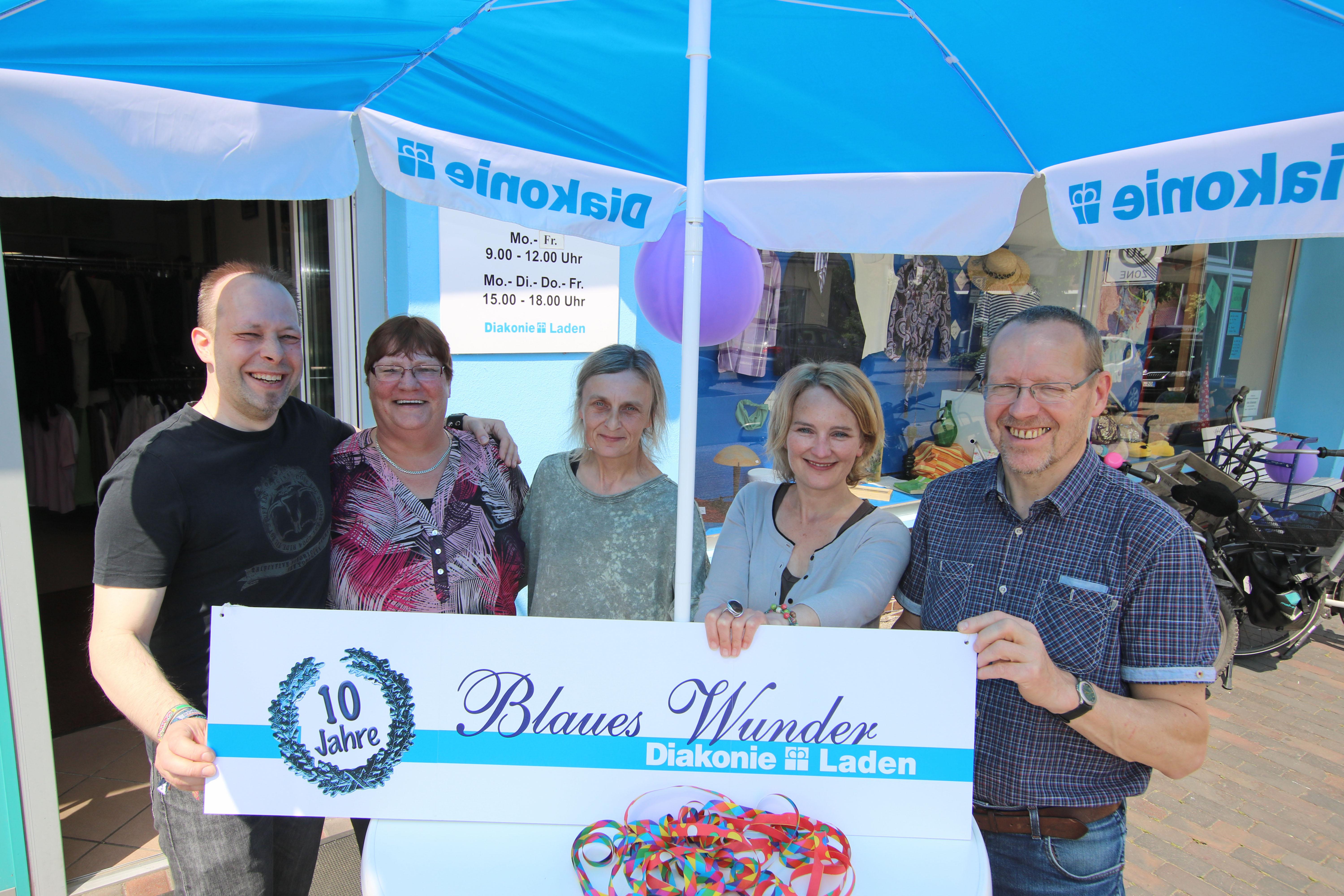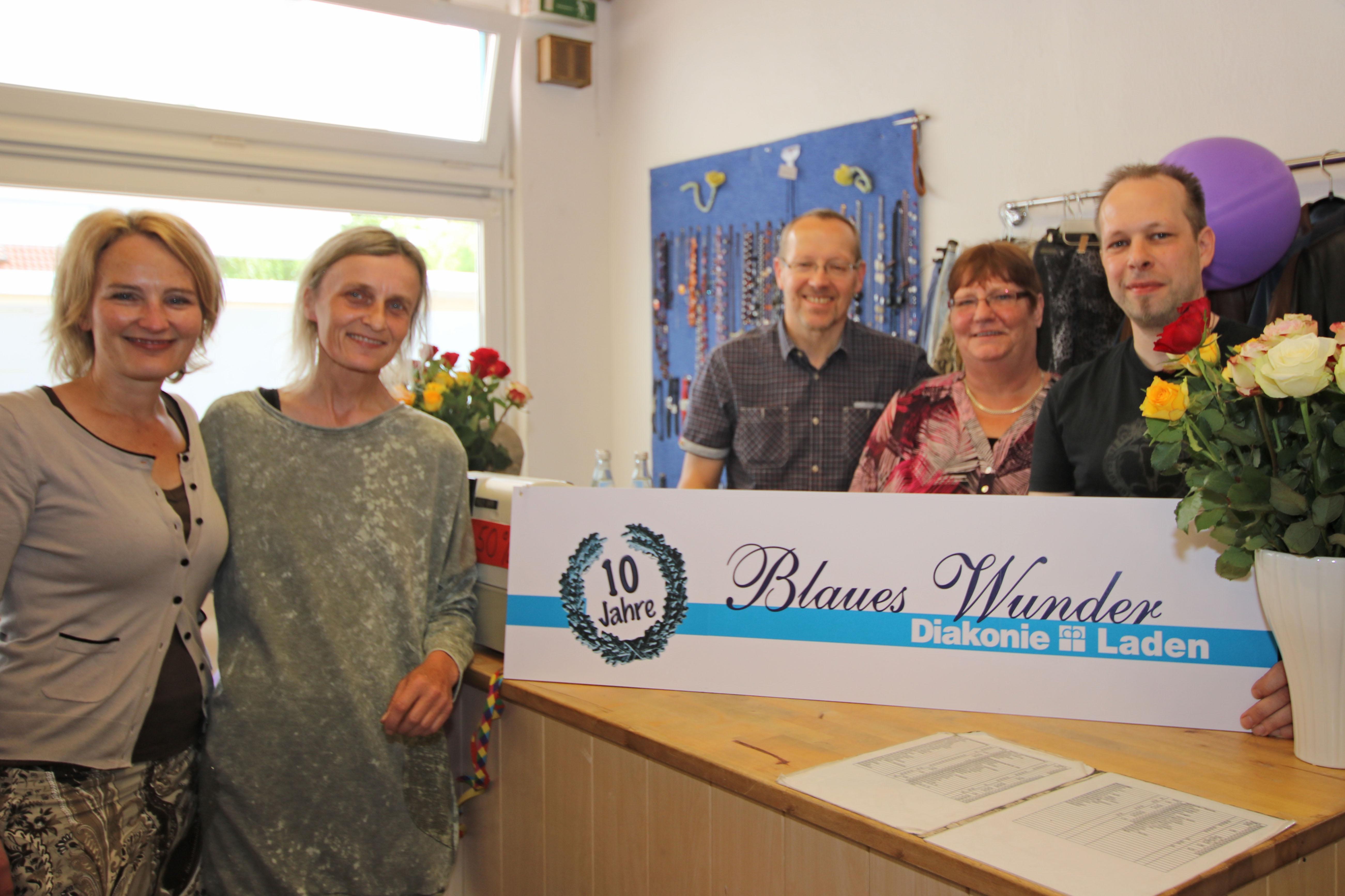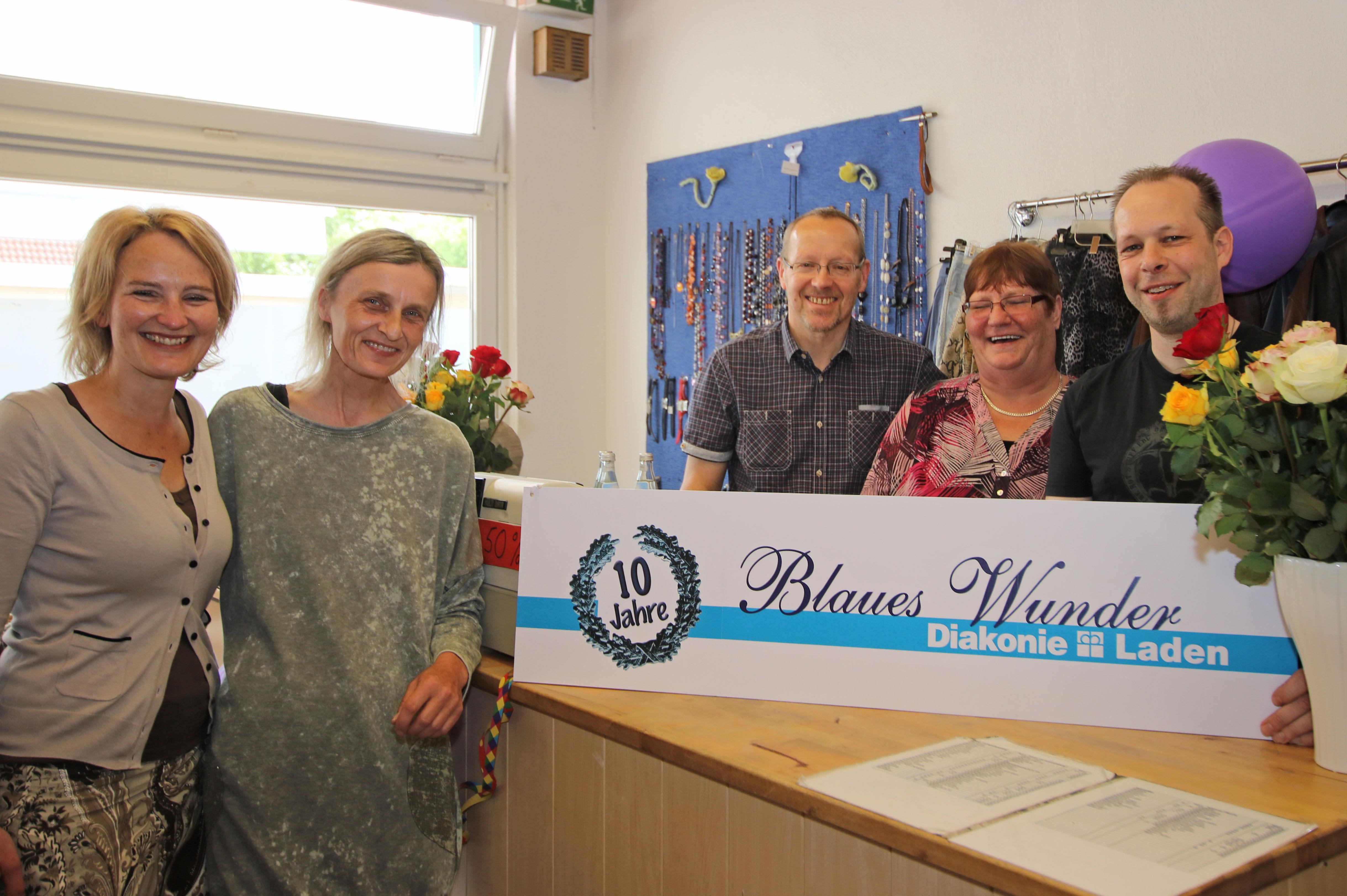 Oldenburg, 16.Mai 2018 - Der vornehmlich von Ehrenamtlichen betriebene Diakonie-Laden im Stadtteil Dietrichsfeld besteht seit 10 Jahren. Diakonie-Pfarrerin Anja Kramer und Diakonie-Kreisgeschäftsführer Heinz-Herman Buse verschenkten Rosen an Mitarbeitende und Kunden. Eingerichtet wurde der Laden auf Anregung von Ehrenamtlichen aus dem Stadtteil Dietrichsfeld, berichtet Buse. Seitdem haben viele zum Gelingen des Projektes Blaues Wunder beigetragen. Spender bringen gebrauchte Kleidung, Hausrat und Spielzeug. Die Mitarbeitenden sortieren und zeichnen die die Second-Hand-Ware aus. So haben Kunden mit schmalen Geldbeutel die Möglichkeit, Kleidung und Artikel für den täglichen Bedarf zu erwerben. Über das Engagement der Ehrenamtlichen freut sich Buse besonders. Manche sind schon lange dabei, andere haben für eine begrenzte Zeit für ein paar Stunden ausgeholfen. Beides ist wichtig, betont Buse. Wer Lust hat, im Laden mit zu arbeiten, kann sich an Beate Schröder im Blauen Wunder wenden.