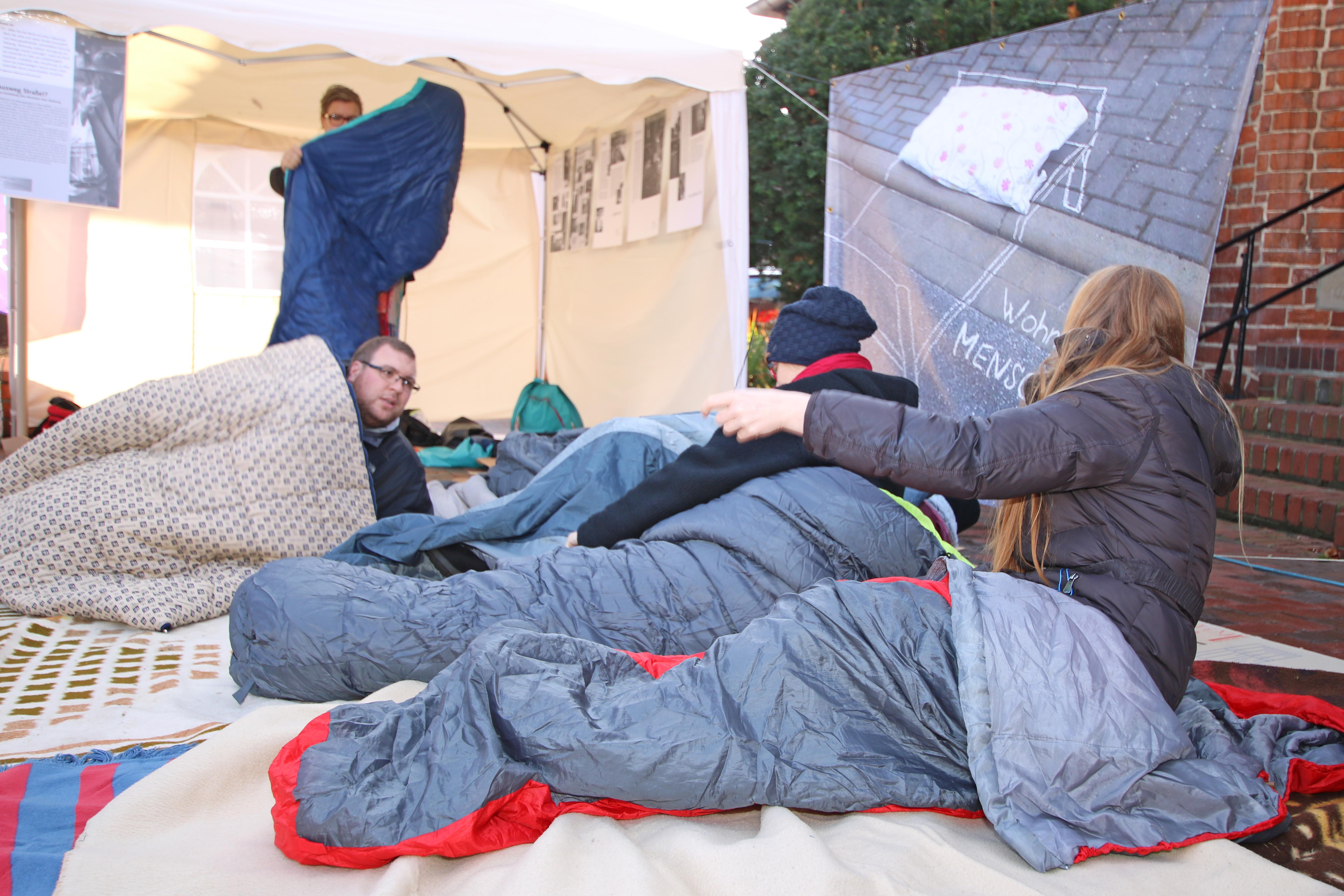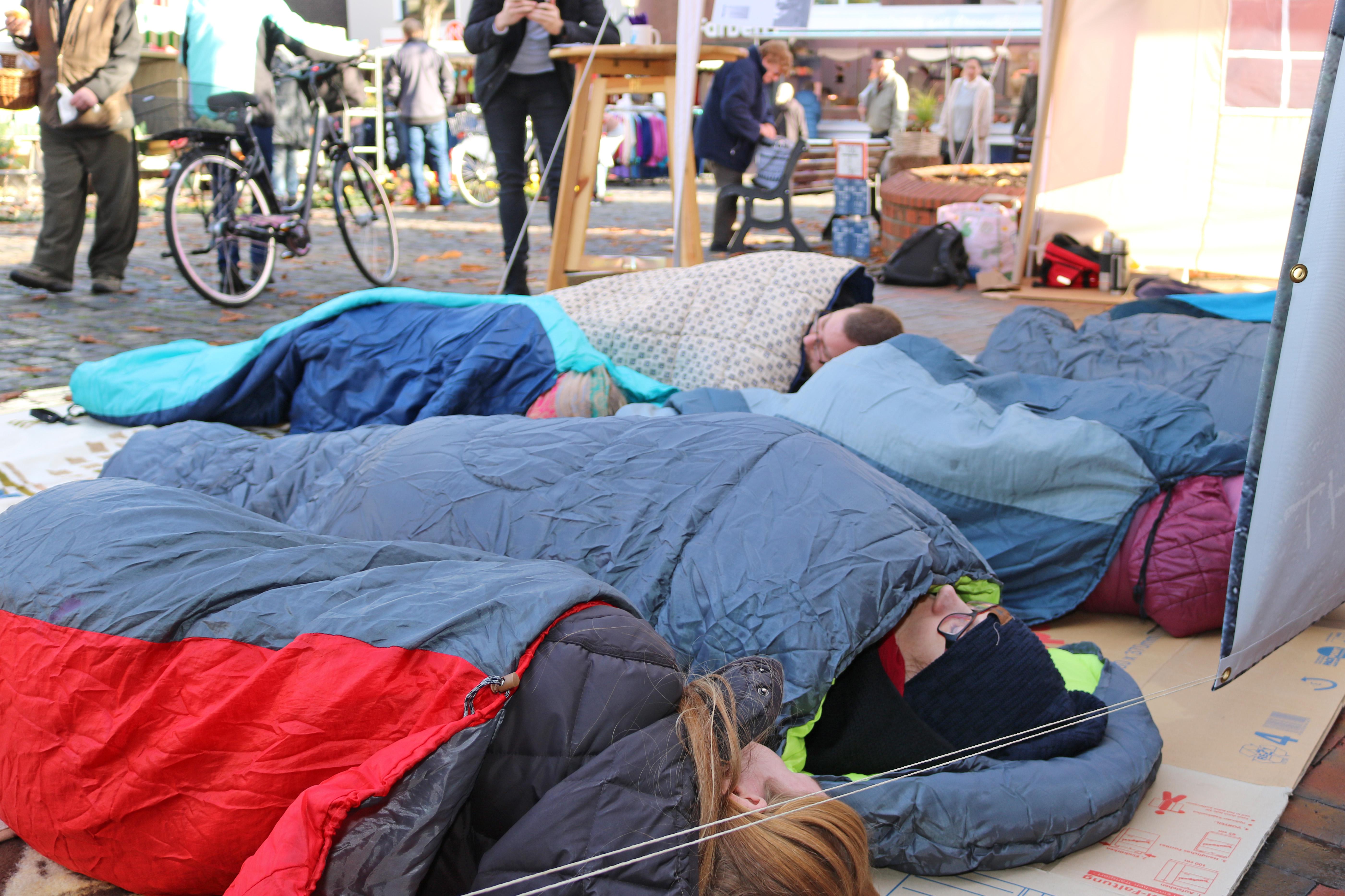 Wildeshausen, 08.11.2018 - Der Pfiff einer Trillerpfeife gellt über den Wildeshauser Marktplatz. Einige Menschen beginnen ihre Sclafsäcke auszupacken und legen sich vor das gotische Backsteinportal des Wildeshauser Rathaus. Einige Zeit später beendet ein weitere Pfiff das skurile Schauspiel.