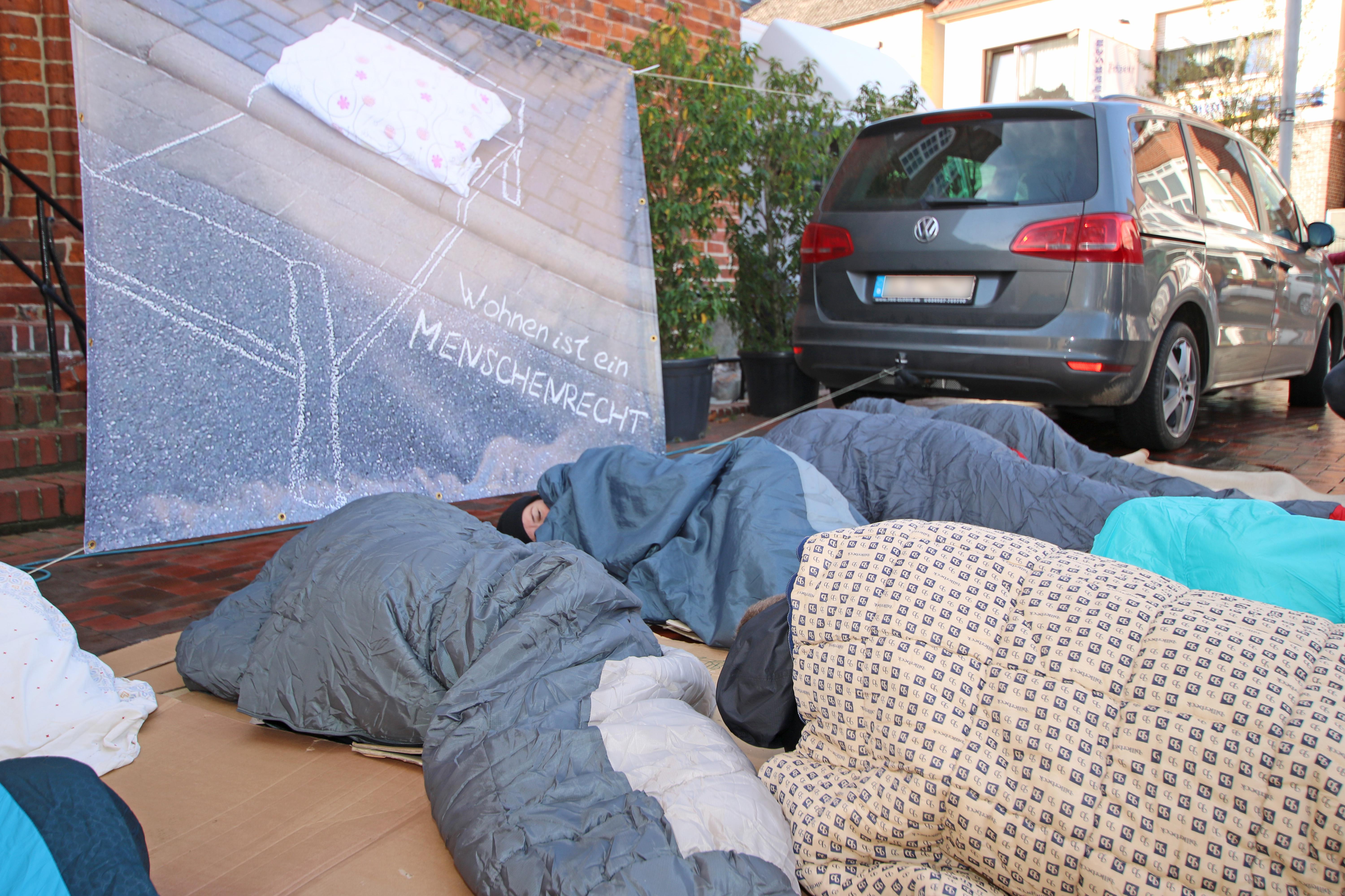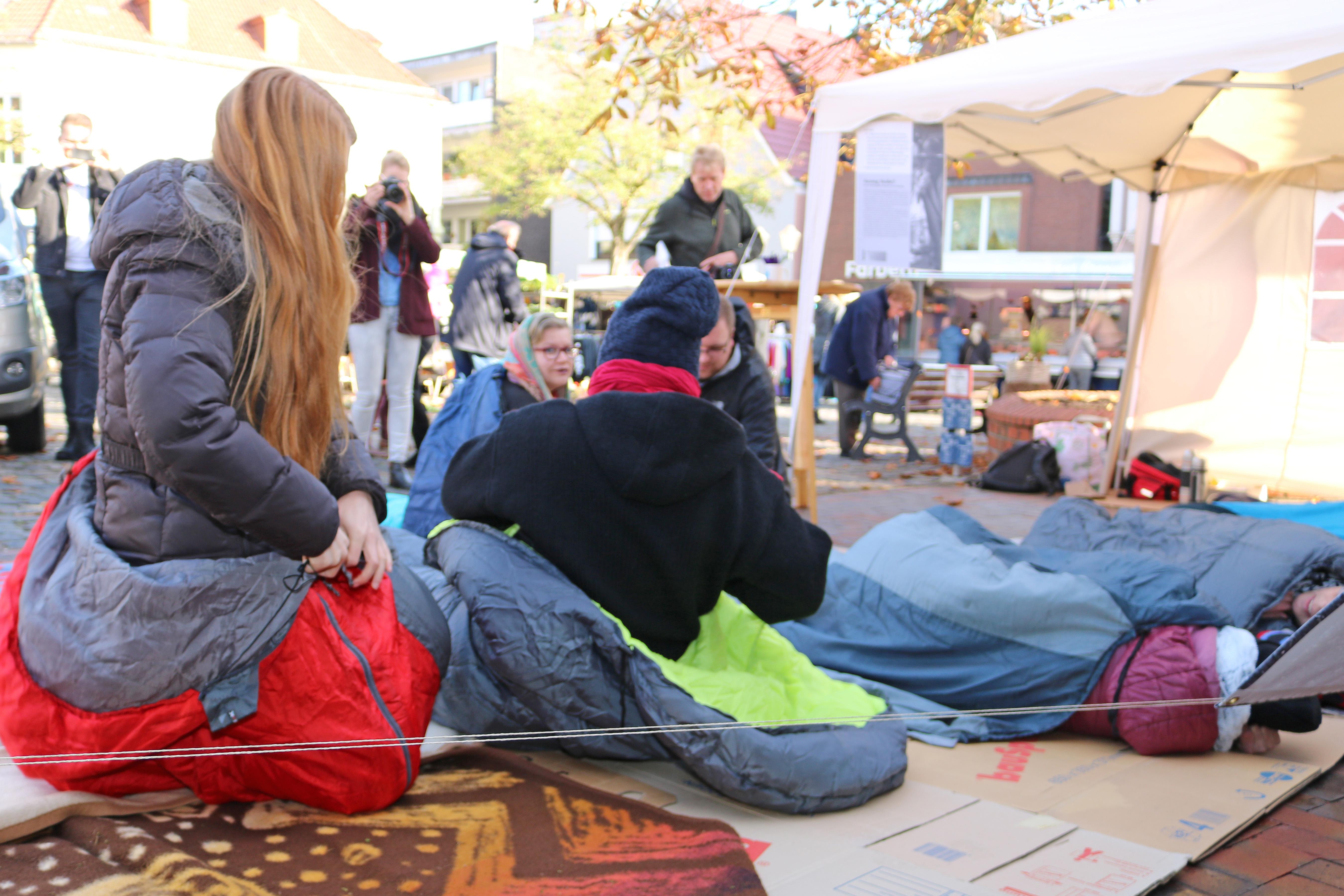 Organisiert und aufgerufen hatte die Diakonie Wohnungslosenhilfe zu diesem Flashmob. Sie wollten damit auf die Situation der Wohnungsloen hinweisen. Im Nordwesten Niedersachsens beobachtet die Zentrale Beratungsstelle seit Jahren ein kontinuierliches Anwachsen der Wohnungsnot. Am letzten Stichtag wurden 1058 wohnungslose Männer und 262 Frauen gezählt. Dazu kommen noch die Menschen denen unmittelbar Wohnungslosigkeit (86) droht und diejenigen, die in eigentlich unzumutbaren Wohnverhältnissen (138) leben. Besonders in städtischen Ballungsräumen sind auch viel junge Menschen unter 25 Jahren betroffen, warnt die Diakonie.