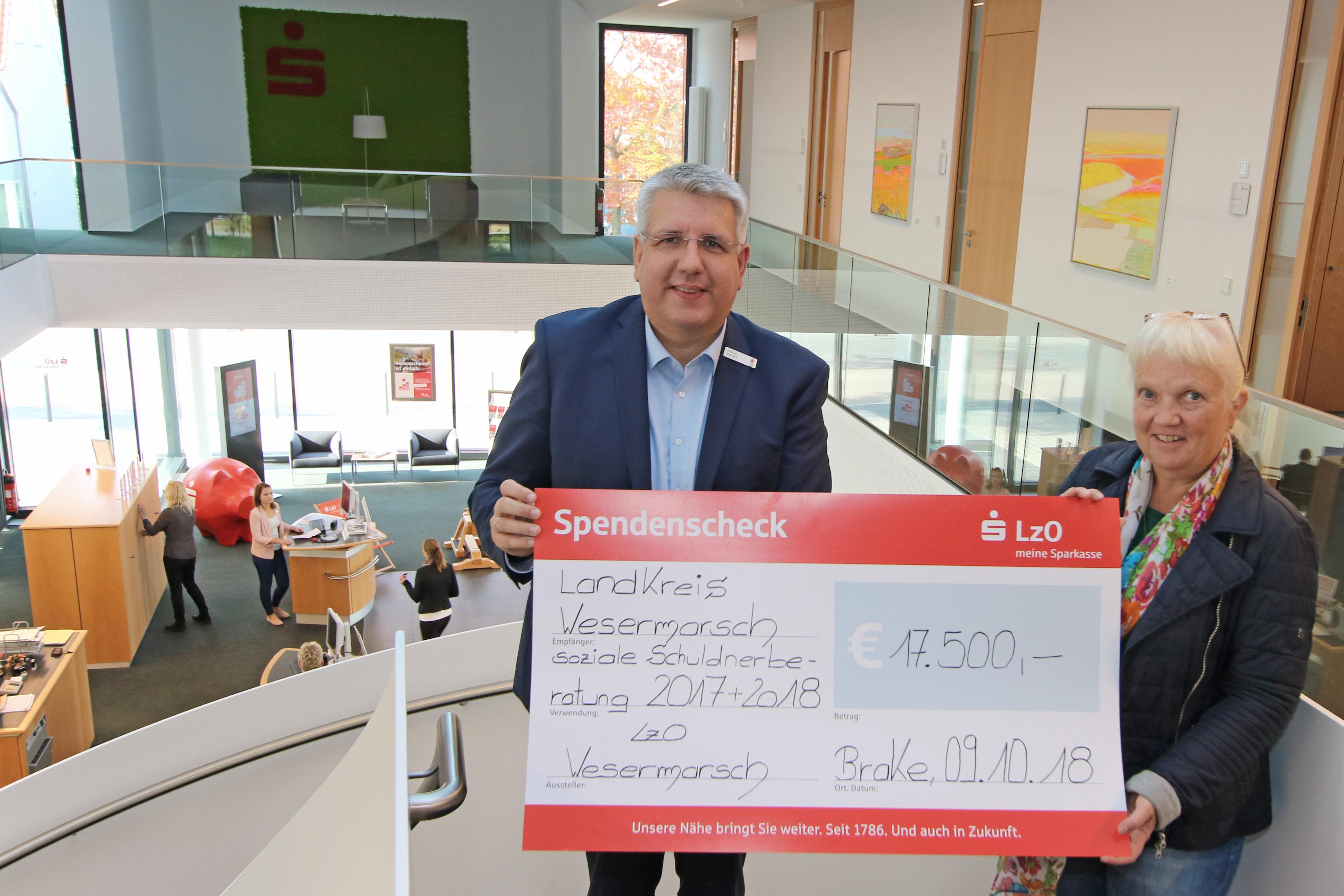 Brake, 09.10.2018 - Anlässlich der symbolischen Übergabe der LzO-Förderung für die Schuldnerberatung der Diakonie erläuterte Karin Schelling-Carstens die besondere Situation überschuldeter Haushalte. 497 Personen haben bei der Diakonie in der Wesermarsch im vergangenen Jahr um Rat gefragt. Mehr als jeder dritte Haushalt davon (38,8%) muss dabei im Schnitt mit 1.049,36 Euro klar kommen und hat etwa 13.000 Euro Schulden, berichtet die Diakonie-Kreisgeschäftsführerin. Die anderen Haushalte ohne Sozialleistungen verfügen im Schnitt über 1400 Euro haben aber um die 33.000 Euro Schulden. LzO-Direktor Andreas Vollert ist froh, dass die Diakonie die soziale Schuldnerberatung anbietet. Auch er weiß, dass es für Betroffene oft ein riesen Schritt ist, sich der schwierigen Situation zu stellen. Wer die zwei Stufen zum Diakonischen Werk in der Bürgermeister-Müller-Straße nimmt, hat schon viel geschafft, erklärt Schelling-Carstens. Mancher kommt gekrümmt herein, geht aber nach der Beratung gerade wieder aus der Tür. Wir nehmen uns Zeit für die Beratung, erklärt Schelling-Carstens. Oft stellt sich dabei heraus, dass ein Privat-Insolvenz nicht die richtige Lösung für alle Seiten ist. Insfern ist die geringe Zahl von 61 Insolvenzverfahren auch eine Erfolgsmeldung.
