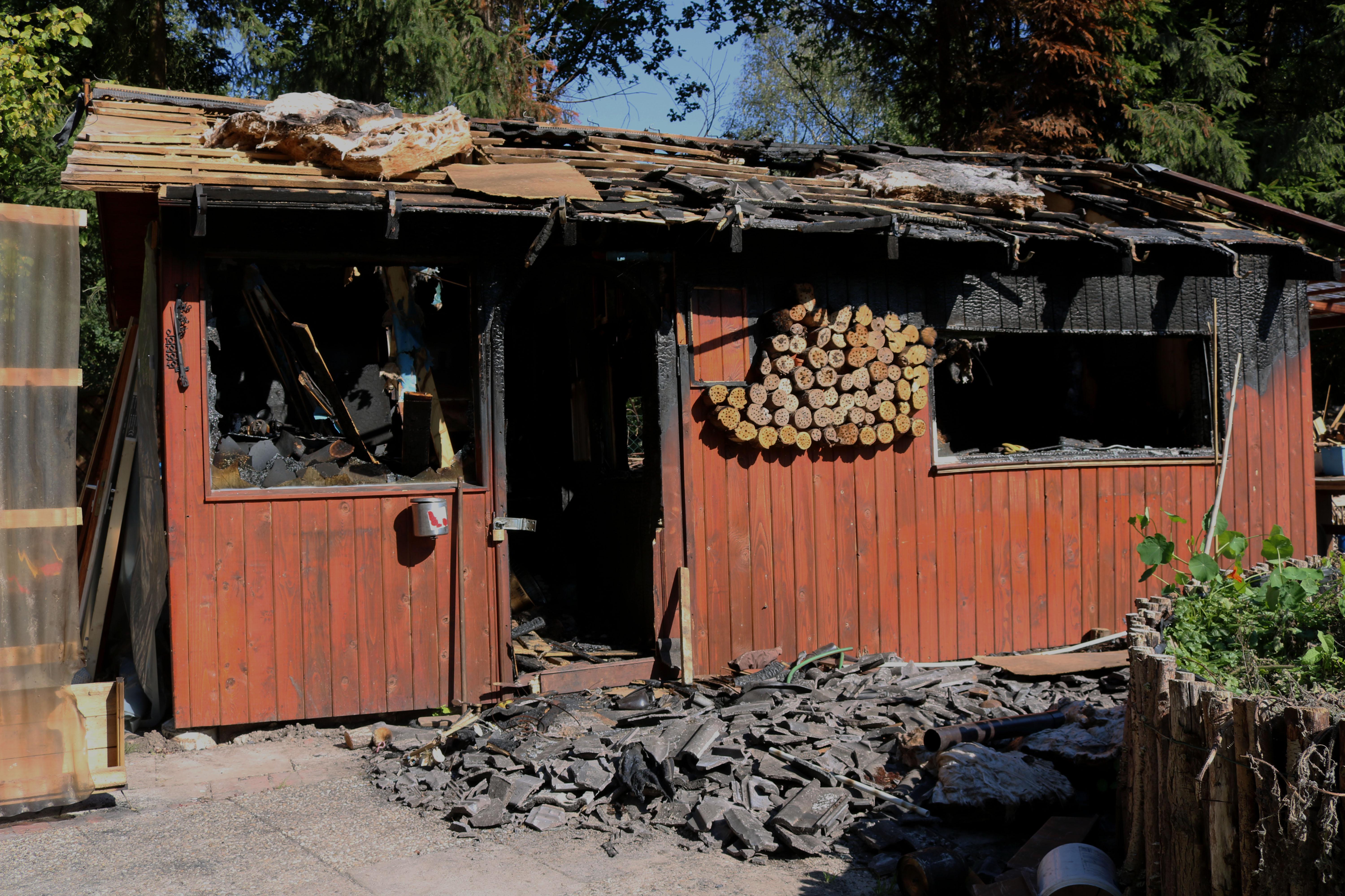 Oldenburg.19.9.2018 – Die Brandruine der alten Hütte ist noch zu sehen. Doch von der ersten Fassungslosigkeit und Wut nach dem Brand der Laube des Diakonie-Projektes „Querbeet“ für Suchtkranke untergebracht war, ist nicht mehr viel zu spüren. Trotz des Totalverlusts von Aufenthaltsraum, Küche und Büro gehen die drei Diakonie-Mitarbeiter und die Teilnehmer des Projektes mit Optimismus und Elan an den Wiederaufbau.