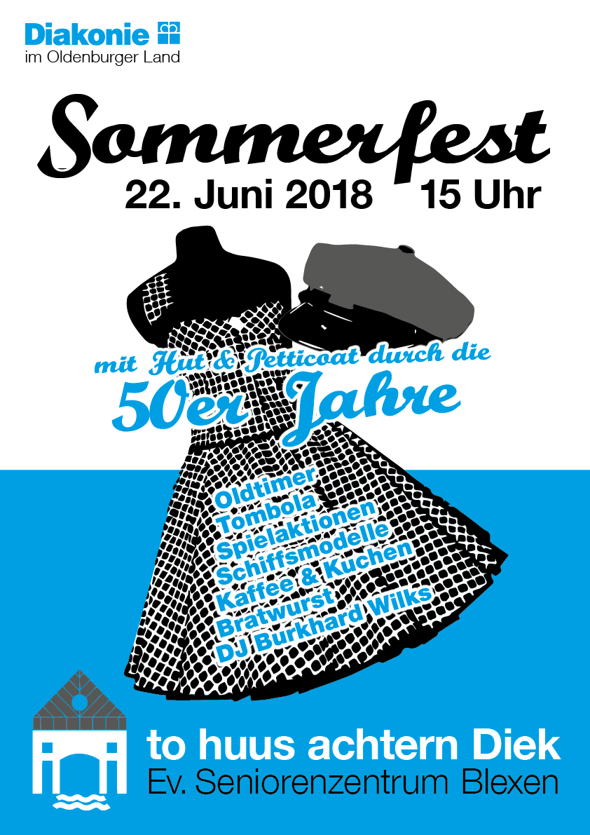 Nordenham, 08.06.2018 – Mit dem Motto „Mit Hut und Petticoat durch die 50er Jahre“ feiert das Ev. Seniorenzentrum „to huus achtern Diek“ ein Sommerfest. Am Freitag, den 22. Juni 2018 gibt es ab 15:00 Uhr Oldtimer zu sehen, eine Tombola und viele andere Überraschungen, kündigt Einrichtungsleiterin Gabriele Redlinger an. Auf dem Teich vorm Seniorenzentrum an der Blexer Fährstraße kreuzen Schiffmodelle. Auf Kinder wartet eine Hüpfburg und weitere Spielaktionen. Mit Kaffee, Kuchen und Bratwurst ist für’s leibliche Wohl gesorgt. DJ Burkhard Wilks sorgt für die passende Musik.