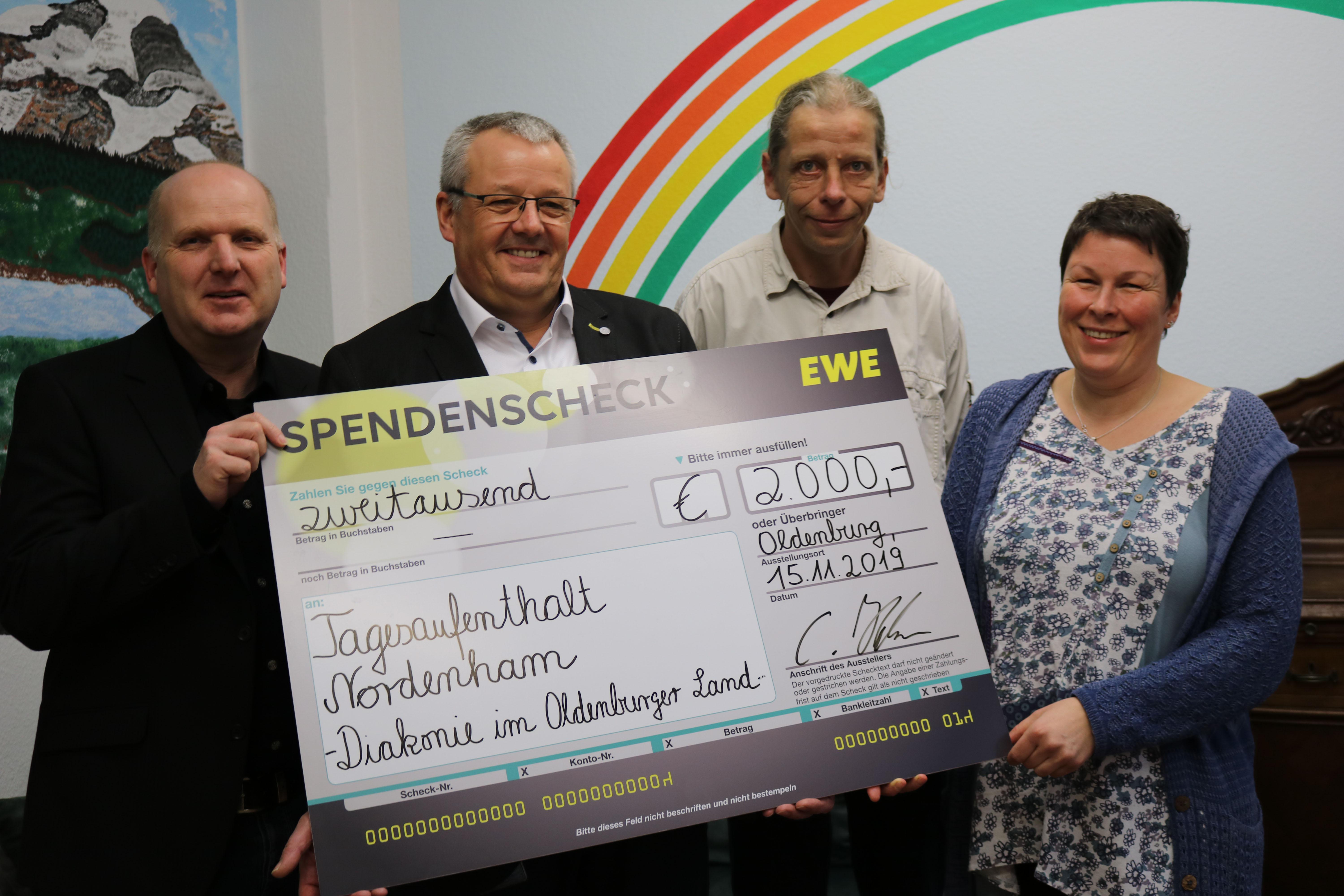 Nordenham/Oldenburg, 15.11.2019 - 2.000 Euro haben die Mitarbeiterinnen und Mitarbeiter von EWE an den Tagesaufenthalt für Wohnungslose in Nordenham gespendet. Julia Durchdenwald und Rudi Domschat vom Diakonie-Tagesaufenthalt haben den Scheck von Fritz-Gerhard Friedrichs (Betriebsratsvorsitzender der Netz- und Geschäftsregion Oldenburg/Varel) in den Räumlichkeiten des Tagesaufenthalts in Nordenham entgegengenommen.