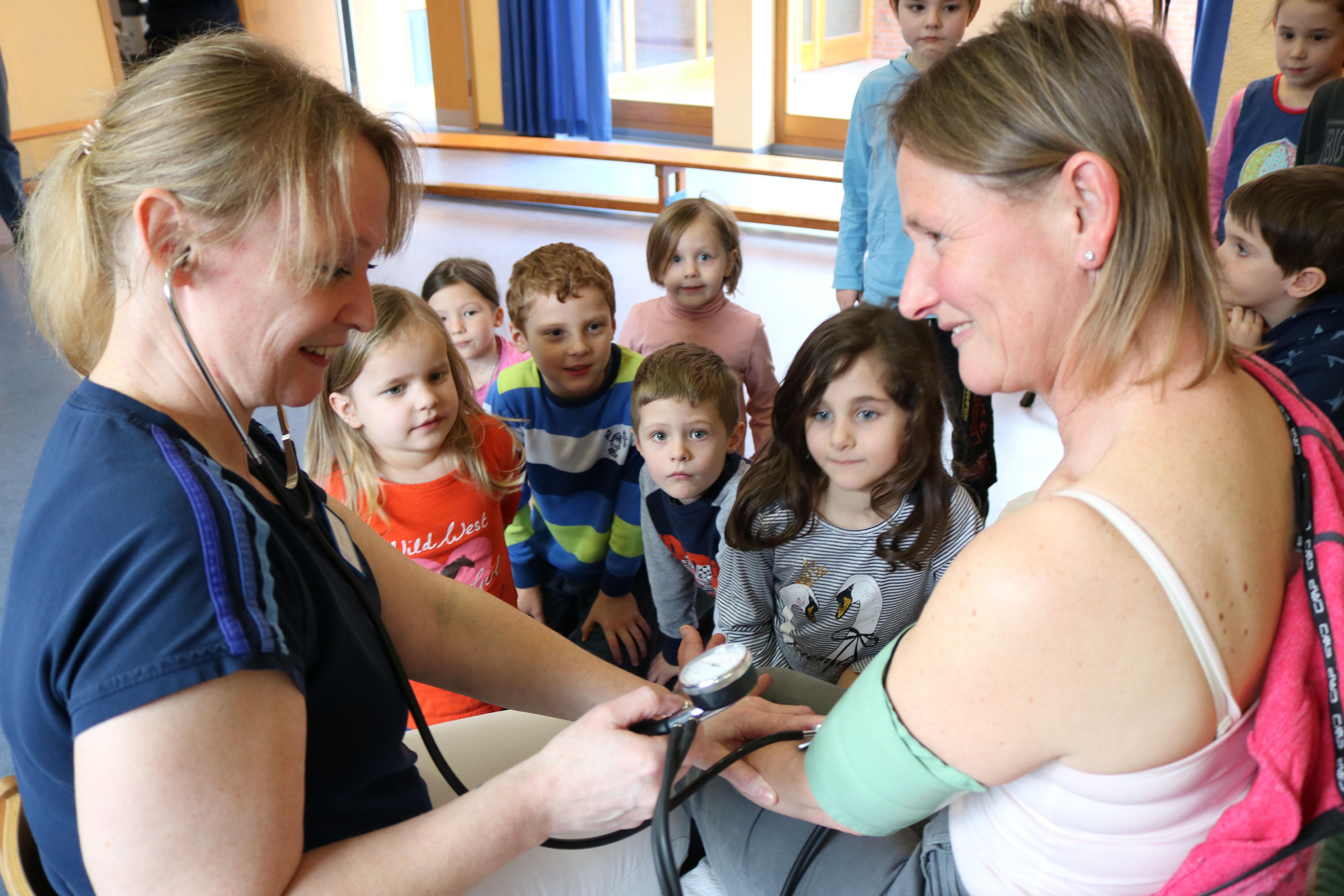 Dazu schlüpft Siegel-Kultermann in die ungewohnte Rolle der Pflegebedürftigen. Verband anlegen, waschen, Blutdruck messen und trösten: Die Kinder können ganz konkret erleben, was zu den Aufgaben der Pflegefachkräfte dazu gehört. Und natürlich sind sie erleichtert, dass die Spritze nicht wehgetan hat. „Bei mir hat es damals auch nur ein bisschen gepieckst“, ruft ein Junge aufmunternd dazwischen.