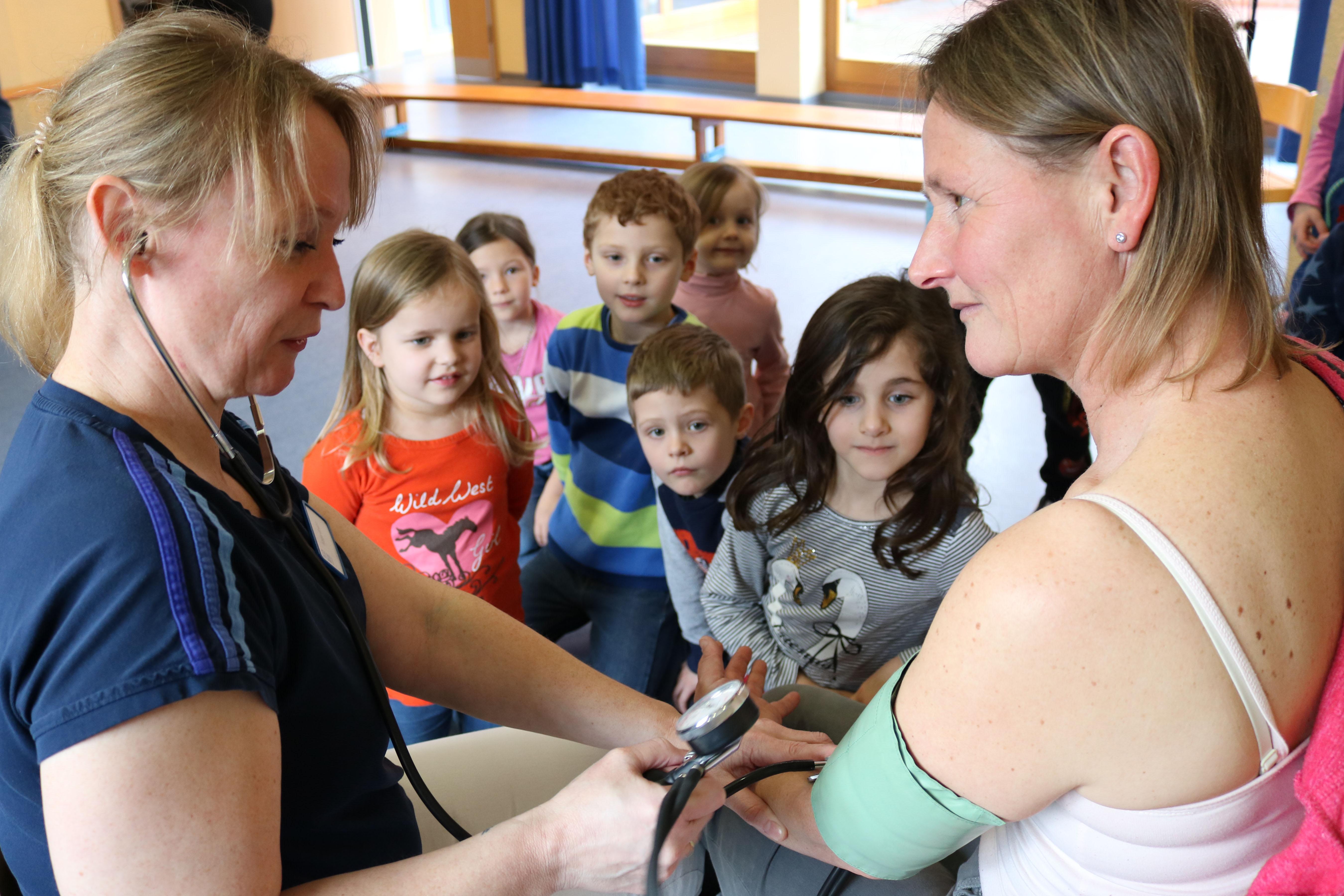 Großenkneten, 20.2.2018 – „Ist das eine echte Spritze?“ Gleich mehrere Kinder stellen diese Frage, als Pflegefachkraft Katja Grehn bei ihrer Kollegin Dagmar Siegel-Kultermann eine Spritze ansetzt. Die beiden Mitarbeiterinnen der Diakonie-Sozialstation sind im Rahmen der Bibelwoche zu Besuch im Evangelischen Kindergarten Regenbogenland in Großenkneten. Sie zeigen den Jungen und Mädchen ganz anschaulich, was es bedeutet, einen Menschen zu pflegen.
