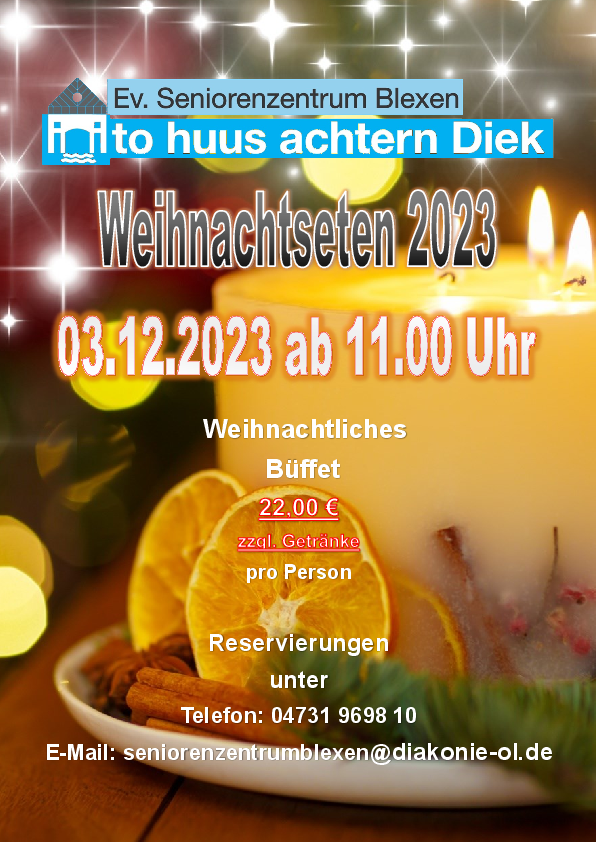 Ab 11 Uhr wird am 3.12 ein weihnachtliches Buffet für 22 Euro (zuzüglich Getränke) geboten. Reservierungen für das Weihnachtsessen sind unter 04731 - 9698 10 oder per Mail an seniorenzentrumblexendiakonie-ol.de möglich.