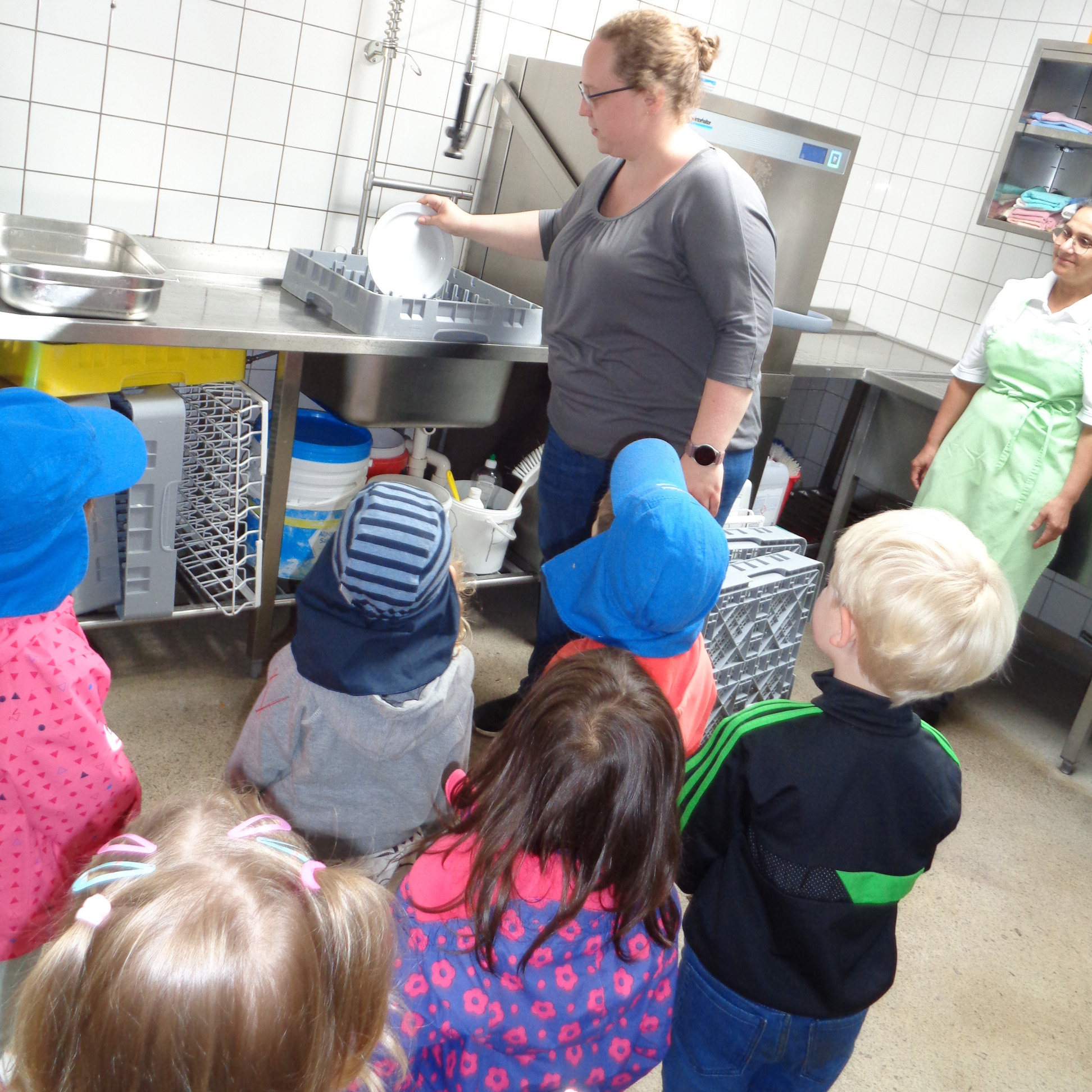 Oldenburg, 20.7.2023 - Die Krippenkinder der DiKiTa haben sich gefragt, woher ihr Mittagessen kommt. Daraufhin sind die Mitarbeitenden der Kindertagesstätte mit den Kindern in den Bus gestiegen und zu ihrem Caterer gefahren. Die Küche der Diadema hat ihren Sitz im PTZ Borchersweg und bekocht neben der DiKiTa auch das Familienzentrum FAZO und die Schüler*innen der Schule und des Horts im PTZ. Lena Müller, die Küchenleiterin, zeigte den Kindern die großen Kochtöpfe, das Kühlhaus und die "Waschanlage". Diese fanden die Kinder besonders spannend.